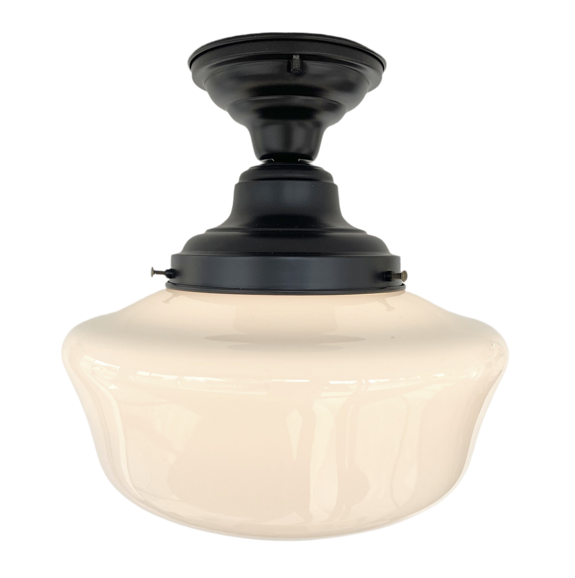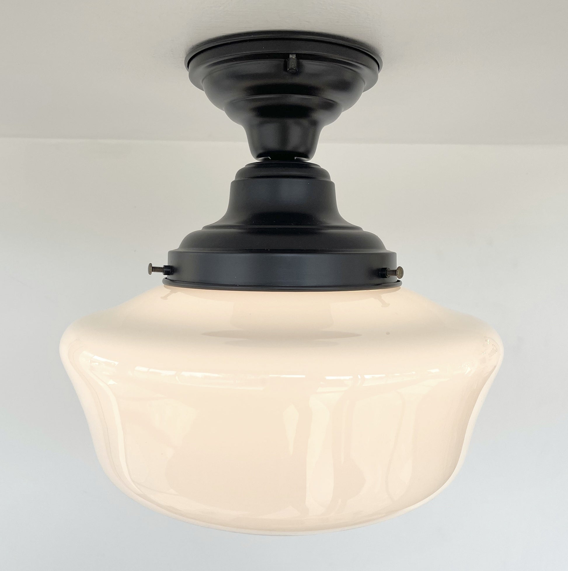 An AUTHENTIC, ORIGINAL Schoolhouse milk glass light with all new wiring from the schools back in the 1930-40's. An Antique Vintage Schoolhouse Milk Glass globe created into a stunning and handsome flush mount ceiling light fixture. A traditional schoolhouse ceiling light for your kitchen or bathroom space with historic and timeless style.