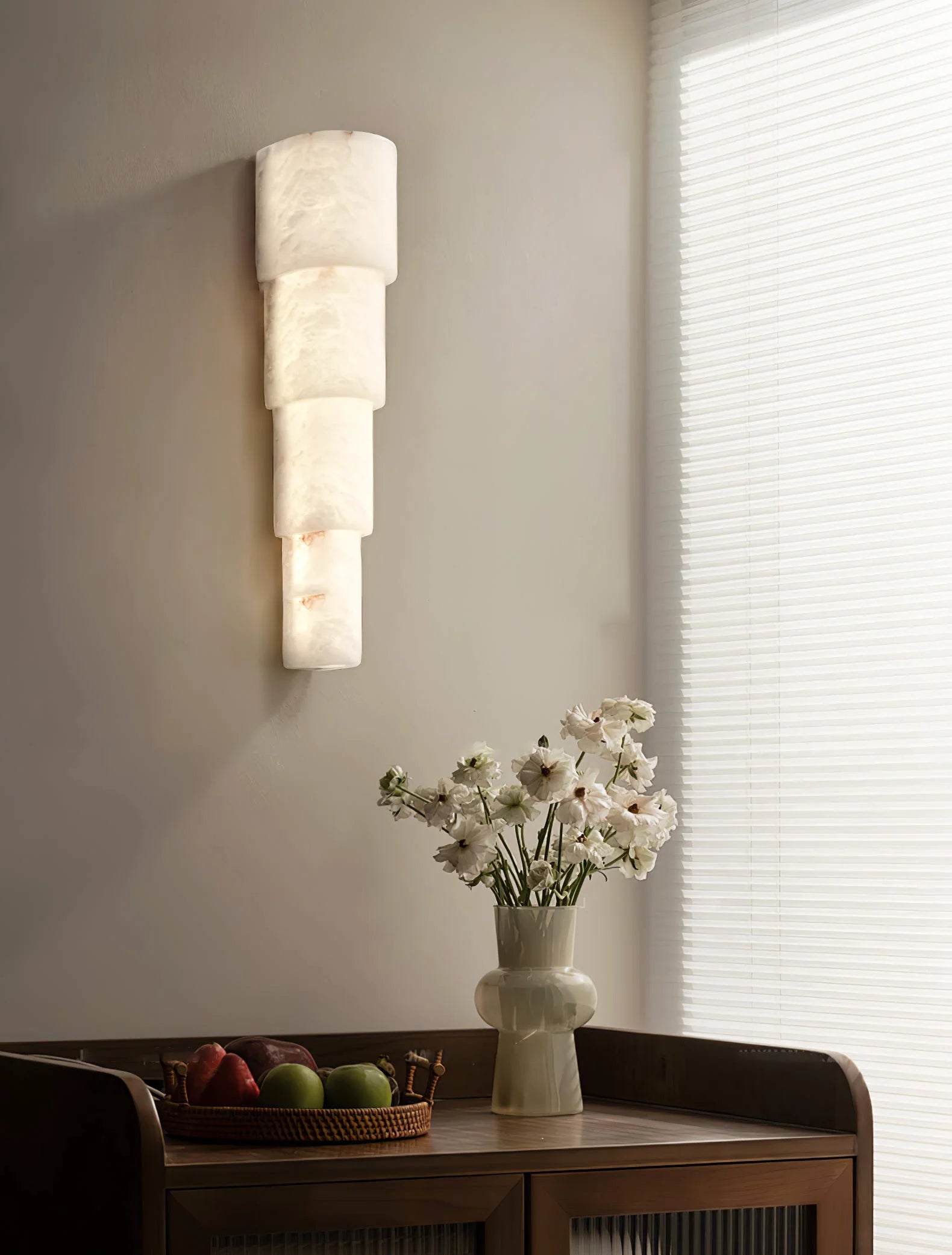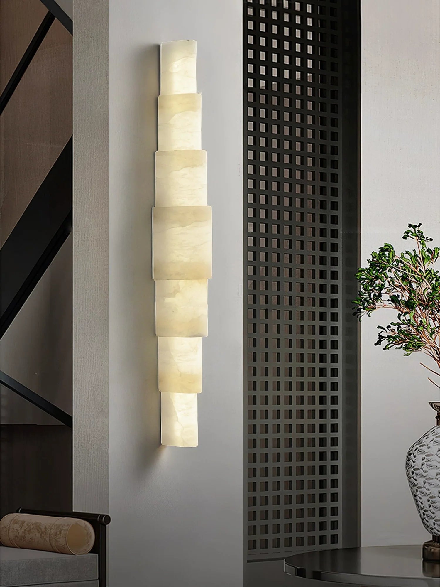 Enhance your space with the Semi Cylindrical Alba Cascade Alabaster Wall Sconce, a sculptural work of art featuring a smooth, vertical design. Made from premium alabaster, this fixture creates a cascading light effect that gently softens the glow, filling your room with a sense of elegant warmth and calm. The carefully stacked layers reveal the alabaster’s natural veining and translucency, allowing light to diffuse softly and beautifully throughout your space.