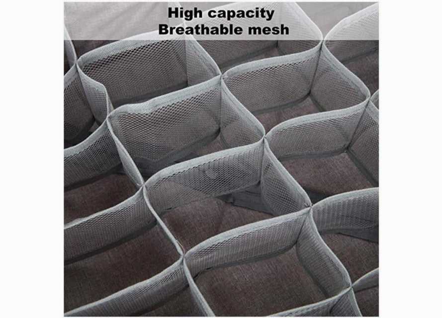 Drawer organizer for socks, undergarments, hair accessories and more. There are 24 sections that allow you to organize your drawers neatly. Made of thick, durable non-woven fabric with mesh interior to allow air circulation. Assemble by zipping the bottom of the unit, and place in the drawer. Folds flat when not in use for easy storage.