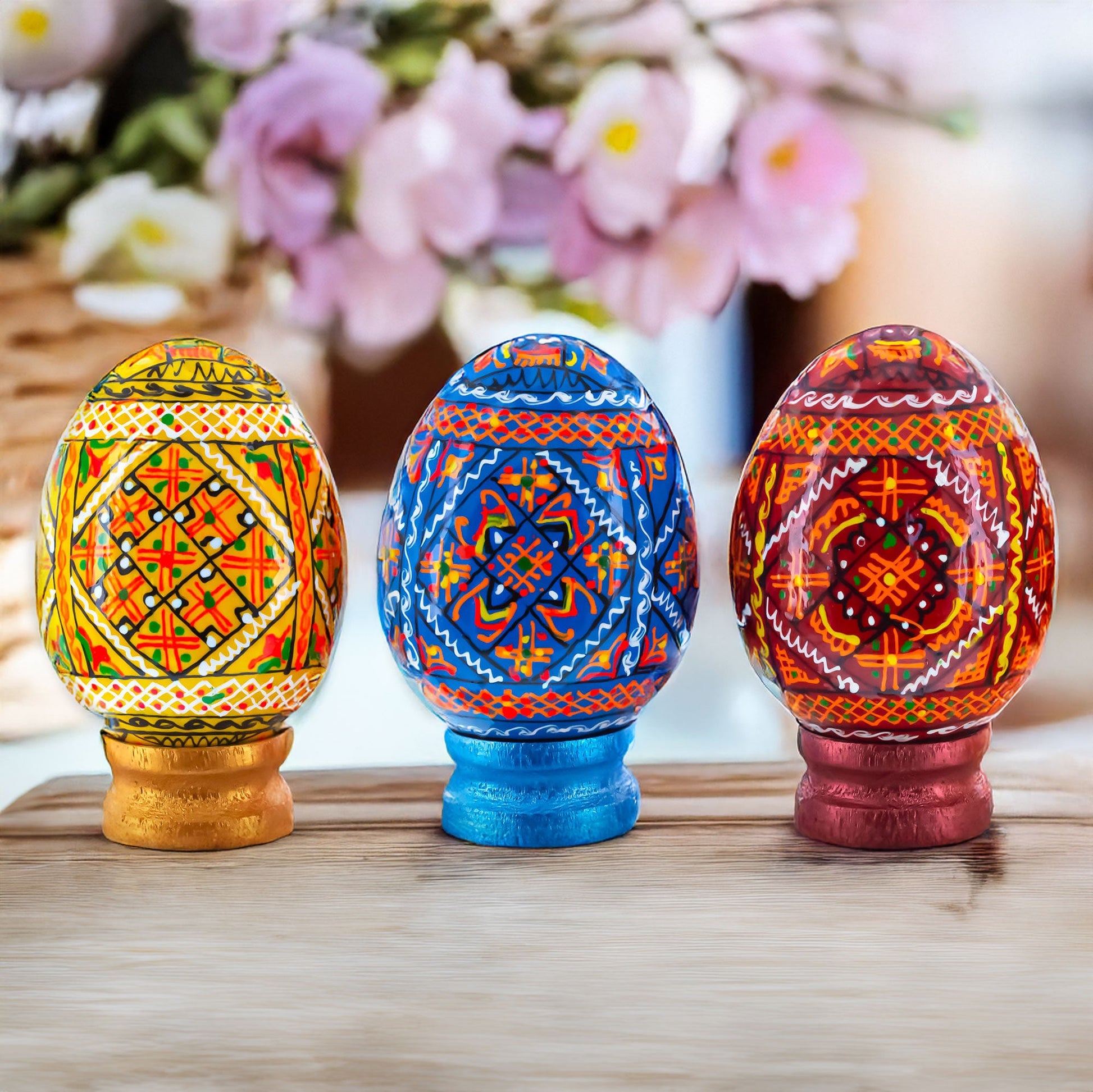 Set of 3 Colorful Geometric Ukrainian Pysanky Wooden Easter Eggs with Stands
