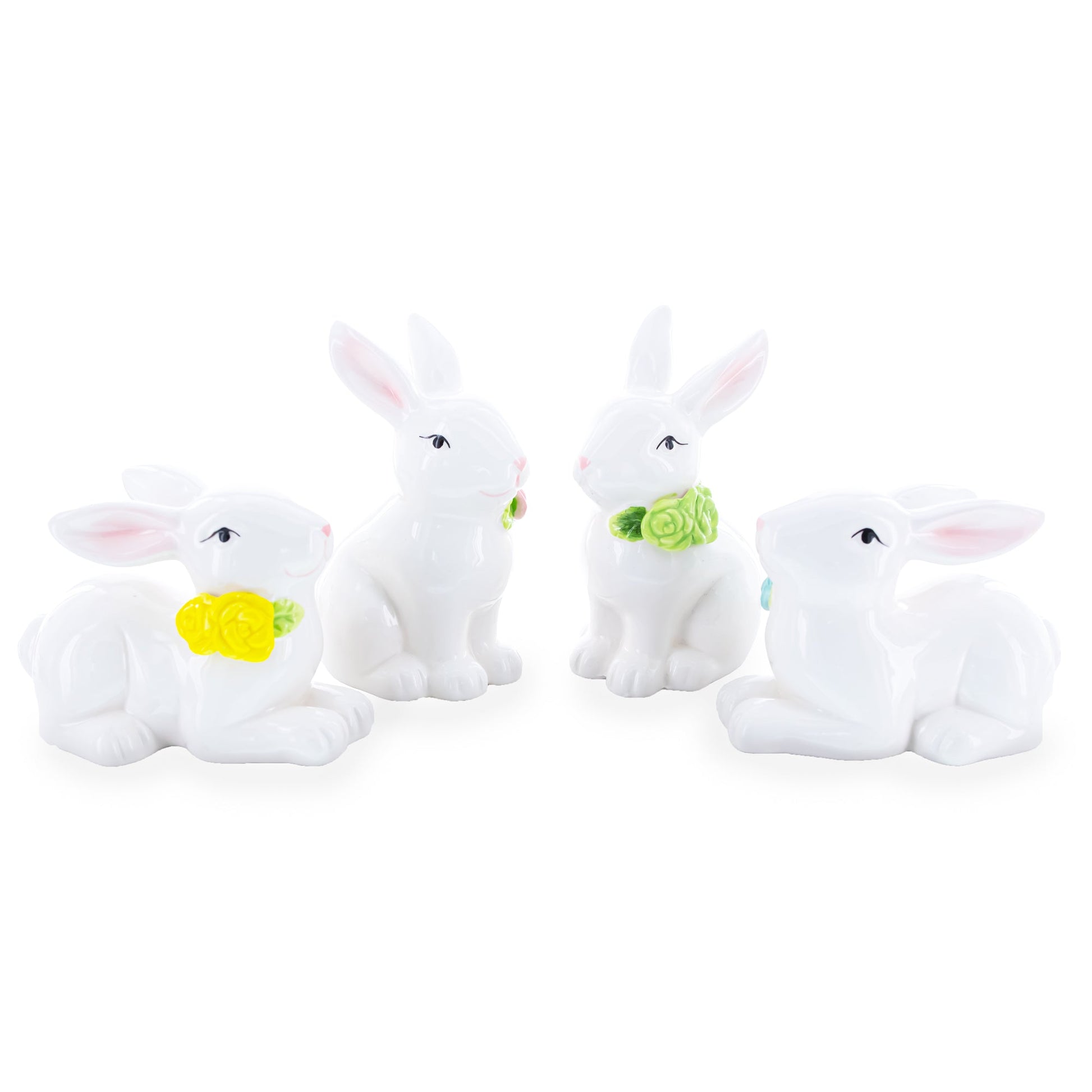 These four decorative pieces are made of a lightweight porcelain. Each bunny is in a different pose and each is tied with a beautiful rose. Display this tabletop decoration for the spring season or Easter holiday.
