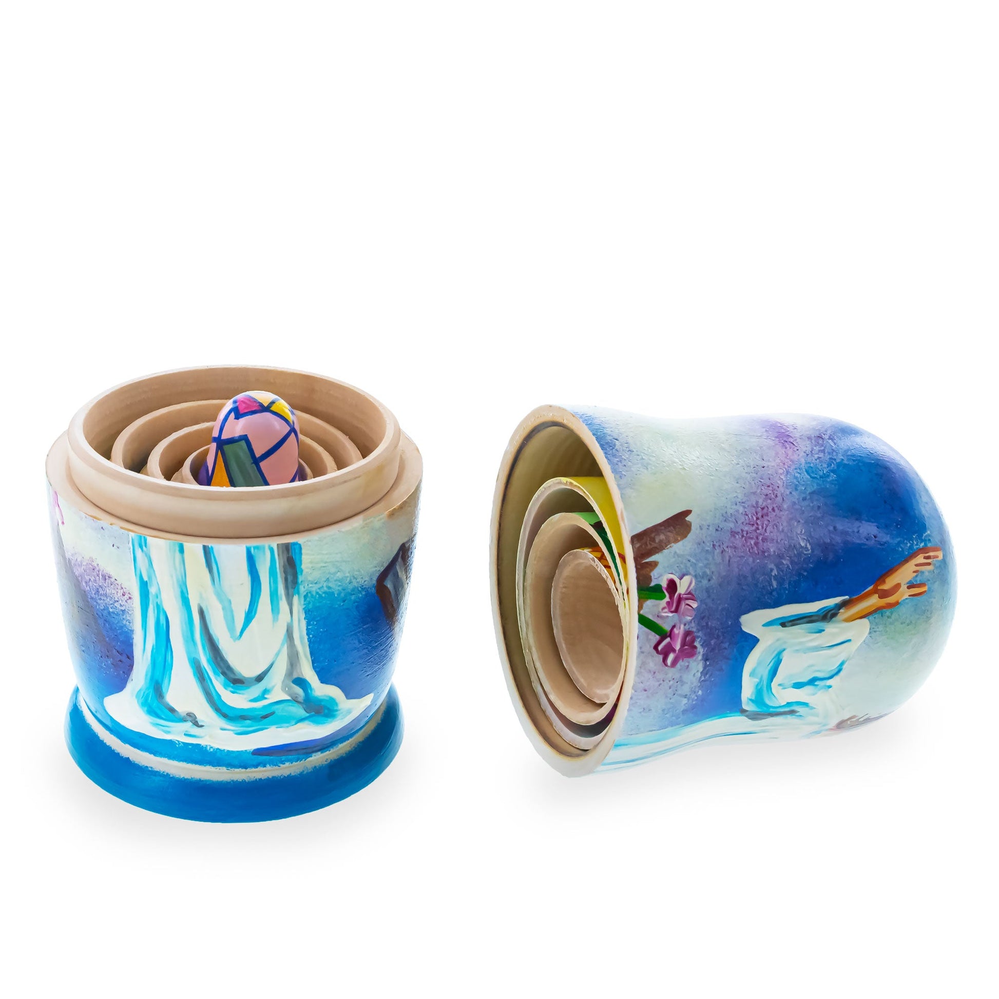 Add a festive touch to your holiday home decor with BestPysanky nesting dolls. This beautiful set consists of 5 figurines which separate, top from bottom, to reveal a smaller figure of the same sort inside, which has, in turn, another figure inside of it, and so on.