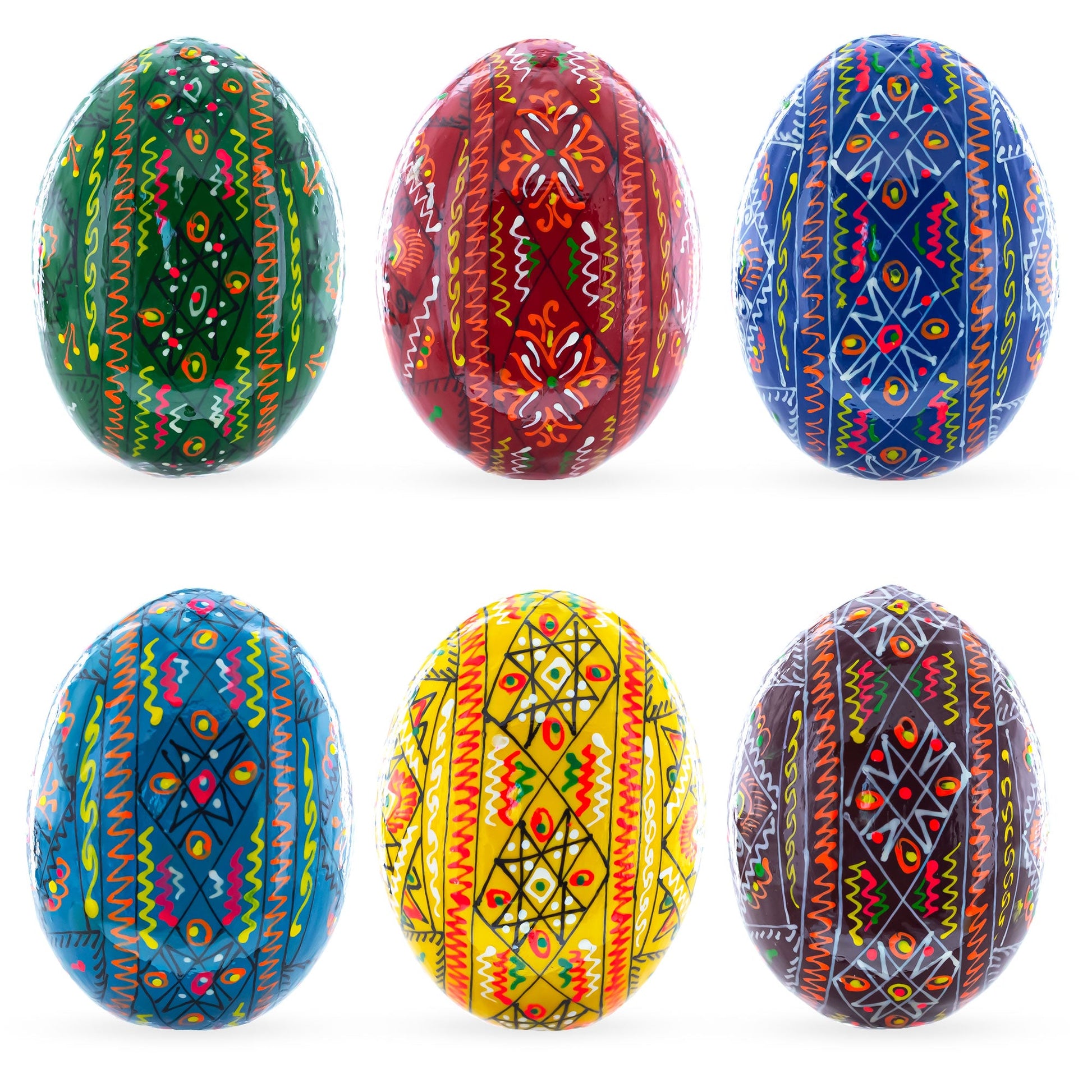 Celebrate holidays with a touch of tradition and artistry with this exquisite set of 6 hand-painted wooden eggs. Adorned with vibrant, intricate designs inspired by authentic Ukrainian folk art, these eggs showcase a stunning array of colors— accented with symbolic geometric patterns and floral motifs. These designs carry deep cultural meaning, representing prosperity, harmony, and protection. Rooted in history, hand-painted Easter eggs have long been cherished as tokens of love, hope, and renewal. Traditionally exchanged among family and friends, they were also displayed in homes to invite blessings and ward off misfortune. This set, crafted in Ukraine and featuring exclusive BestPysanky designs, continues this timeless tradition, offering a meaningful way to celebrate the season. Perfect for Easter baskets, table centerpieces, or as unique gifts, these eggs are more than just decorations—they are works of art that connect you to a rich cultural heritage. Whether displayed as a collection, shared with loved ones, or used to spark conversations, these hand-painted treasures are sure to create lasting memories. Packaged in a clear plastic bag, they are ready to bring joy and beauty to your Easter celebrations. Share the magic of Ukrainian pysanky and embrace the spirit of renewal and rebirth this holiday season!