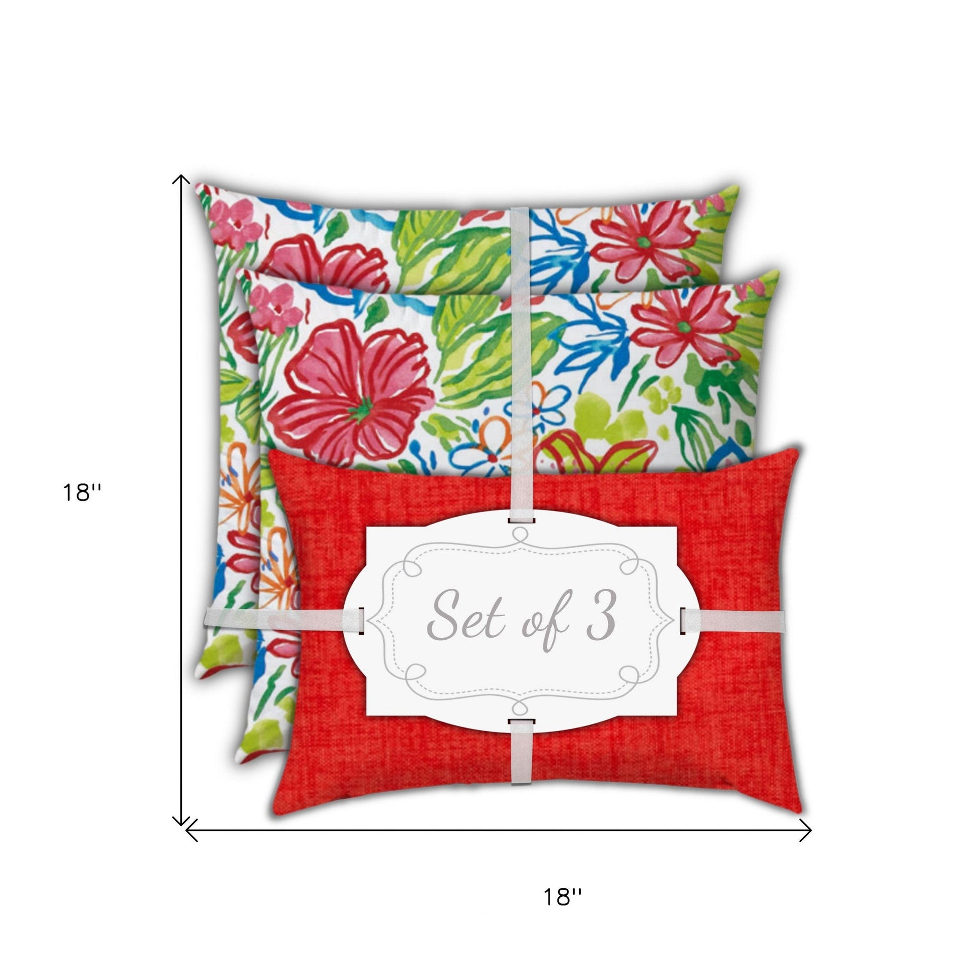 Set Of Three 18" X 18" Red And White Blown Seam Floral Throw Indoor Outdoor Pillow
