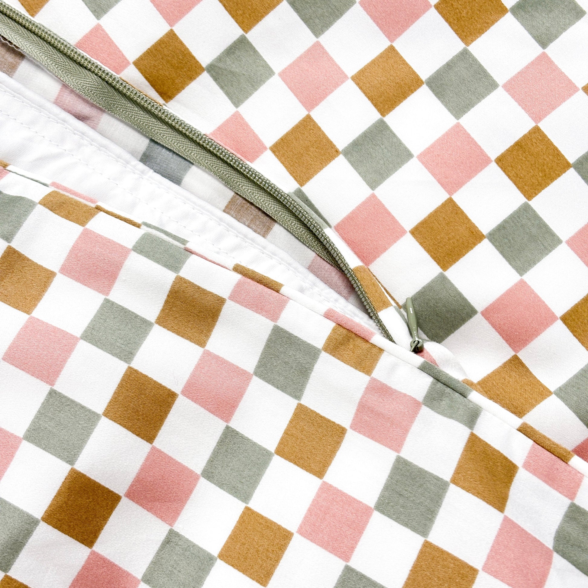 Transform bedtime into a breeze with the SHNUGGLE 3-pc bedding set in colorful checker! Clever hidden snaps keep the duvet cover snugly attached to the quilt insert, making linen changes a snap—literally. Made from soft, wrinkle-resistant 400-thread-count cotton with zero chemical finishes or dyes, it’s as gentle on your skin as it is easy to care for. Wash, dry, and pop it right back on the bed for cozy comfort that’s always ready to roll!