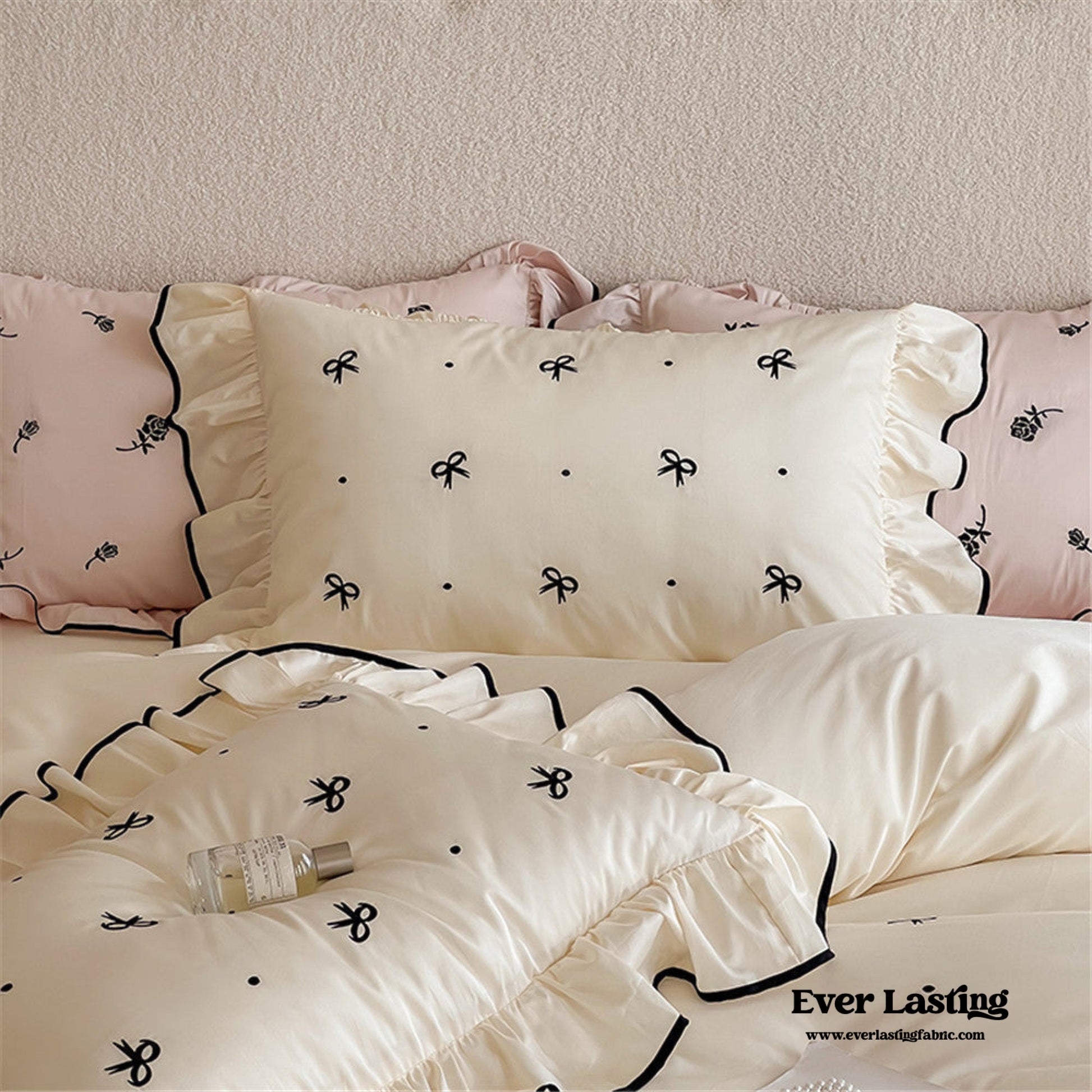 Transform your bedroom into a romantic haven with our Silky Ribbon Ruffle Bedding Set. This exquisite set combines delicate ribbon embroidery and ruffle details, infusing your sleep space with a touch romance that's hard to resist. The silky fabric not only adds a touch of elegance but also ensures luxurious comfort, making it a dream to snuggle up in.