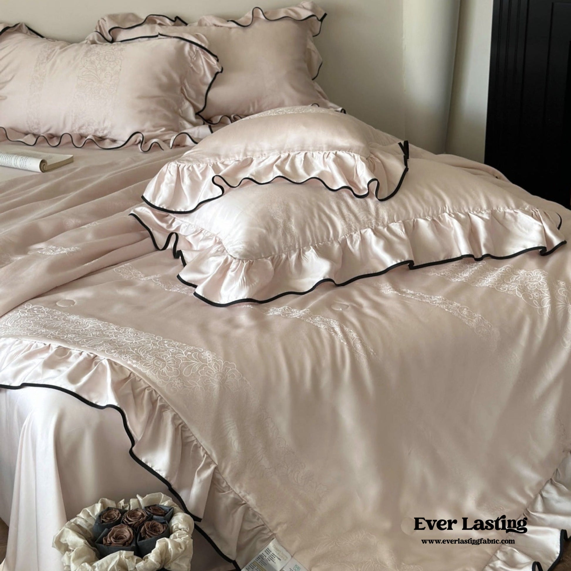Introducing our Silky Ruffle Blanket Comforter Set, where captivating soft coquette aesthetics meet cooling and silky comfort. Meticulously crafted with an incredibly soft and smooth texture, this set boasts a flowing jacquard weave that adds an extra touch of sophistication to your bedroom decor. Made from a luxurious blend of 20% pure silk and 80% super fine down, this bedding ensemble guarantees breathability, comfort, and durability while providing a gentle and cooling touch against your skin. Experience the perfect blend of opulence, style, and sweetness as you indulge in the elegance of our Silky Ruffle Blanket Comforter Set.