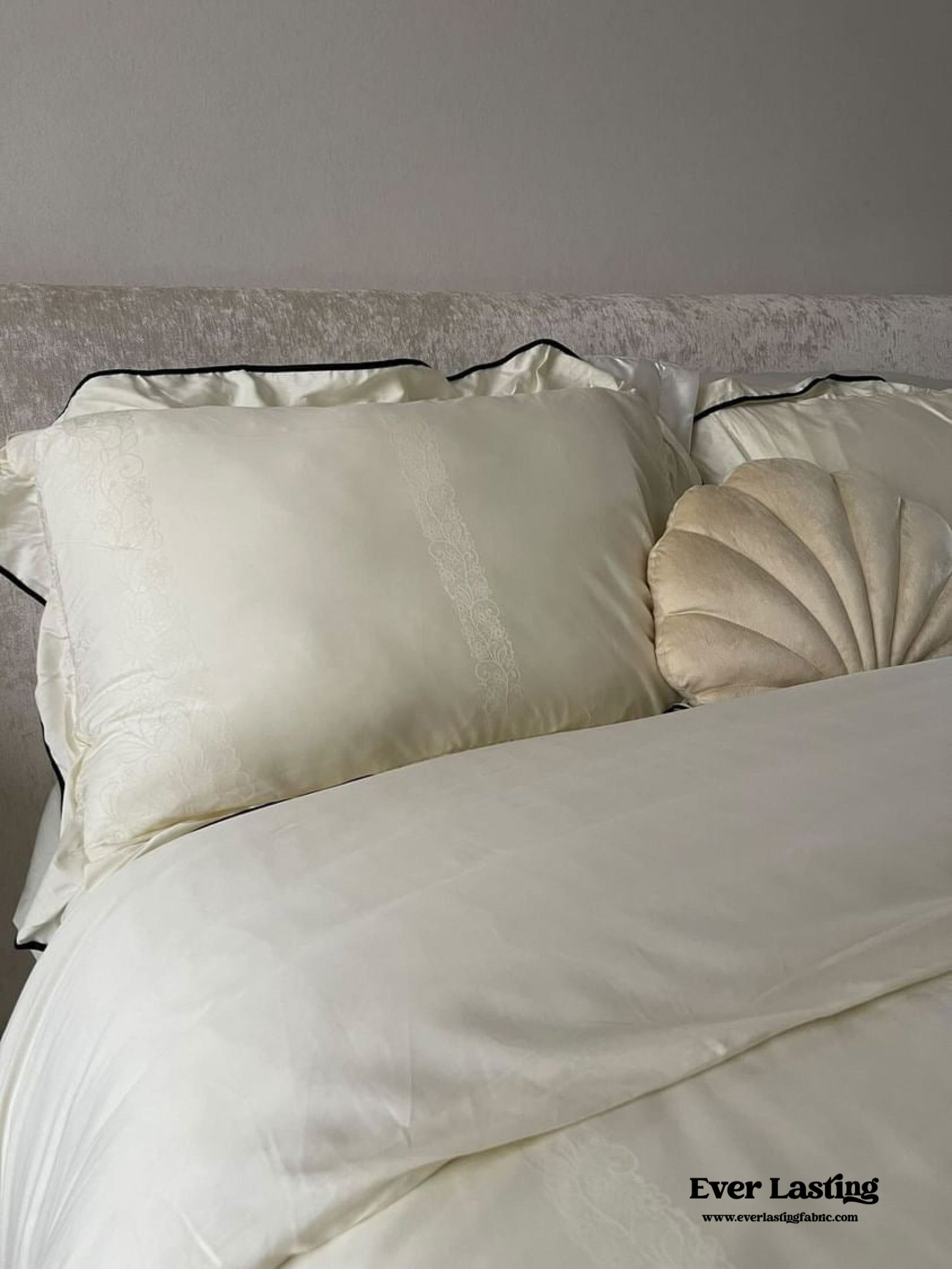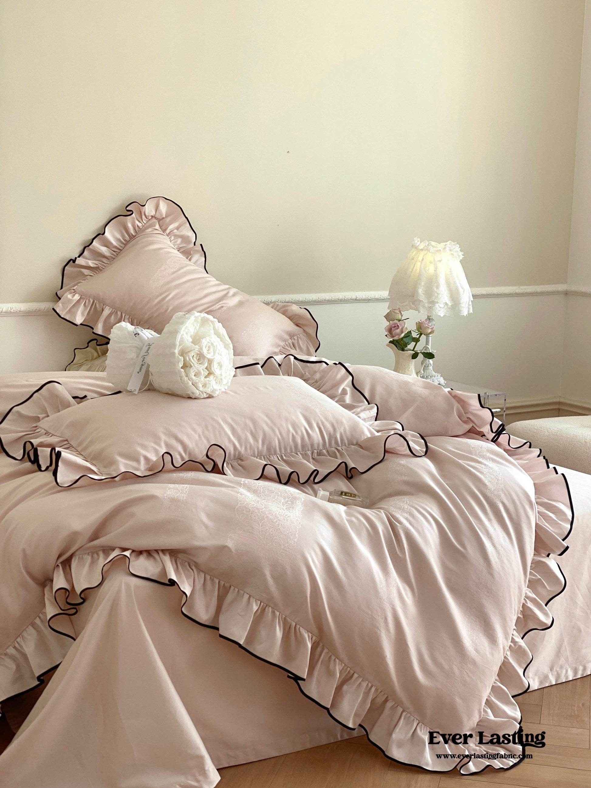 Indulge in the captivating soft coquette aesthetic of our Silky Ruffle Pillowcases, designed to enhance your bedroom with elegance. The fabric is meticulously crafted with an incredibly soft and smooth texture, accentuated by its flowing jacquard weave. Made from luxurious 100S Australian cotton fabric, it guarantees breathability, comfort, and durability while providing a gentle touch against your skin. The pillowcases' design boasts a refined wide black stripe and a beautiful ruffled hem, effortlessly adding a touch of sophistication to your bedroom decor. Immerse yourself in the perfect blend of opulence, style, and sweetness with our Silky Ruffle Pillowcases.