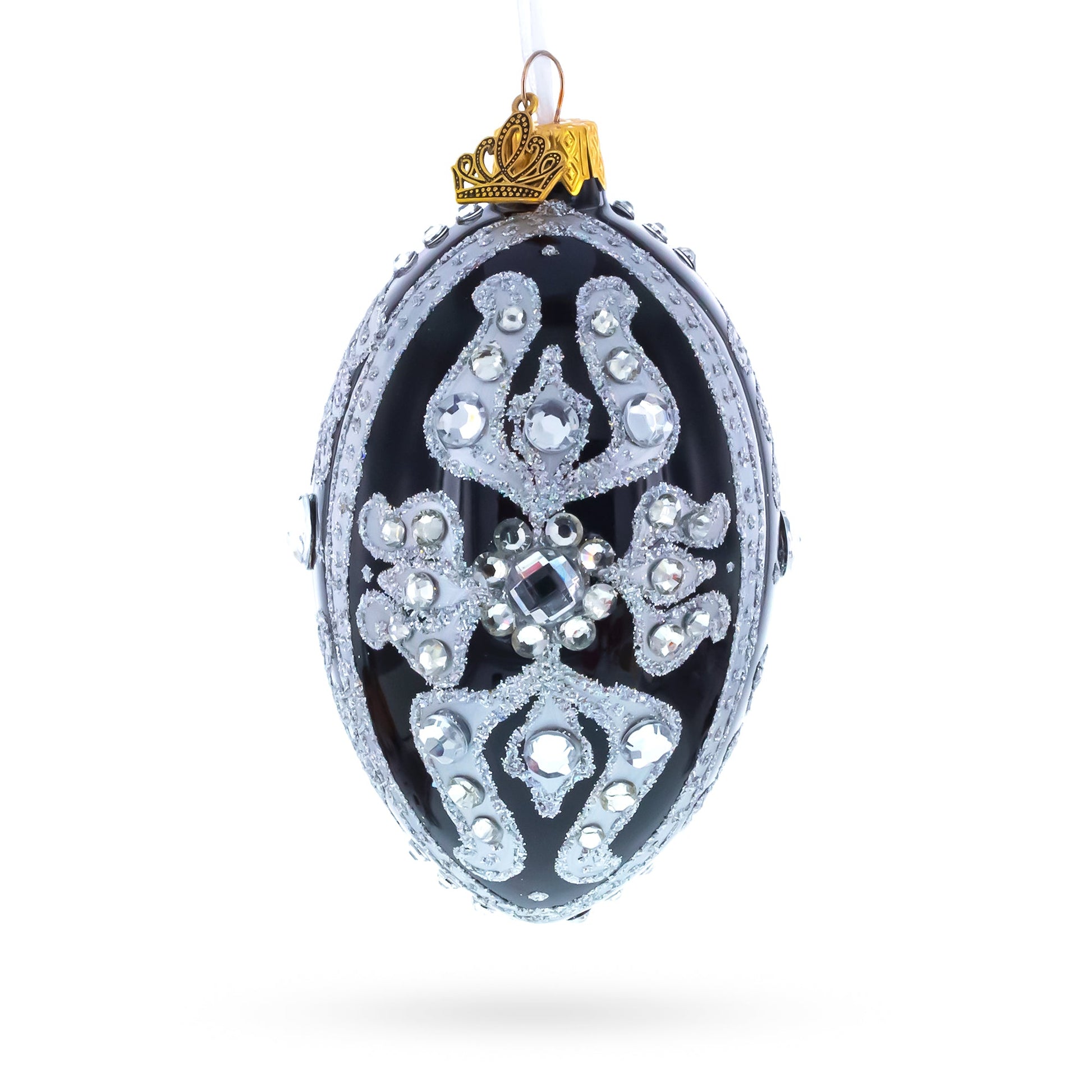Silver and Crystal Floral Pattern on Black Glass Egg Ornament 4 Inches