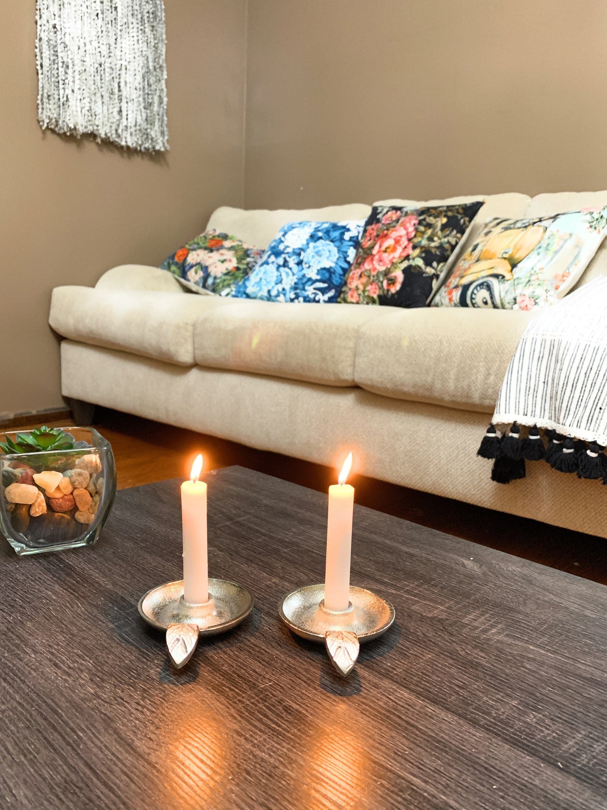 100% Aluminum. Set of 2 Taper Candle Holder with rustic silver finish. Handle is shape of a leaf. Handcrafted by Artisan Dimensions: 3.6"L, 3.6" W, 1.5"H. Dish is 3.6", 3.8 oz Great for weddings, restaurants, spas and other decorative purposes Perfect for standard size taper candles Add a touch of elegance and charm to any space with these beautifully crafted 100% aluminum candlestick holders. With a rustic silver finish and a unique leaf-shaped handle, these holders are both stylish and practical. Perfect for weddings, restaurants, spas, or any other decorative setting, these candlestick holders will add a warm and welcoming ambiance to any occasion. Handcrafted by skilled artisans, each holder measures 3.6"L x 3.6"W x 1.5"H and can hold standard size taper candles. Whether you're hosting a special event or looking for a new way to decorate your home, these candlestick holders are the perfect addition to your collection.