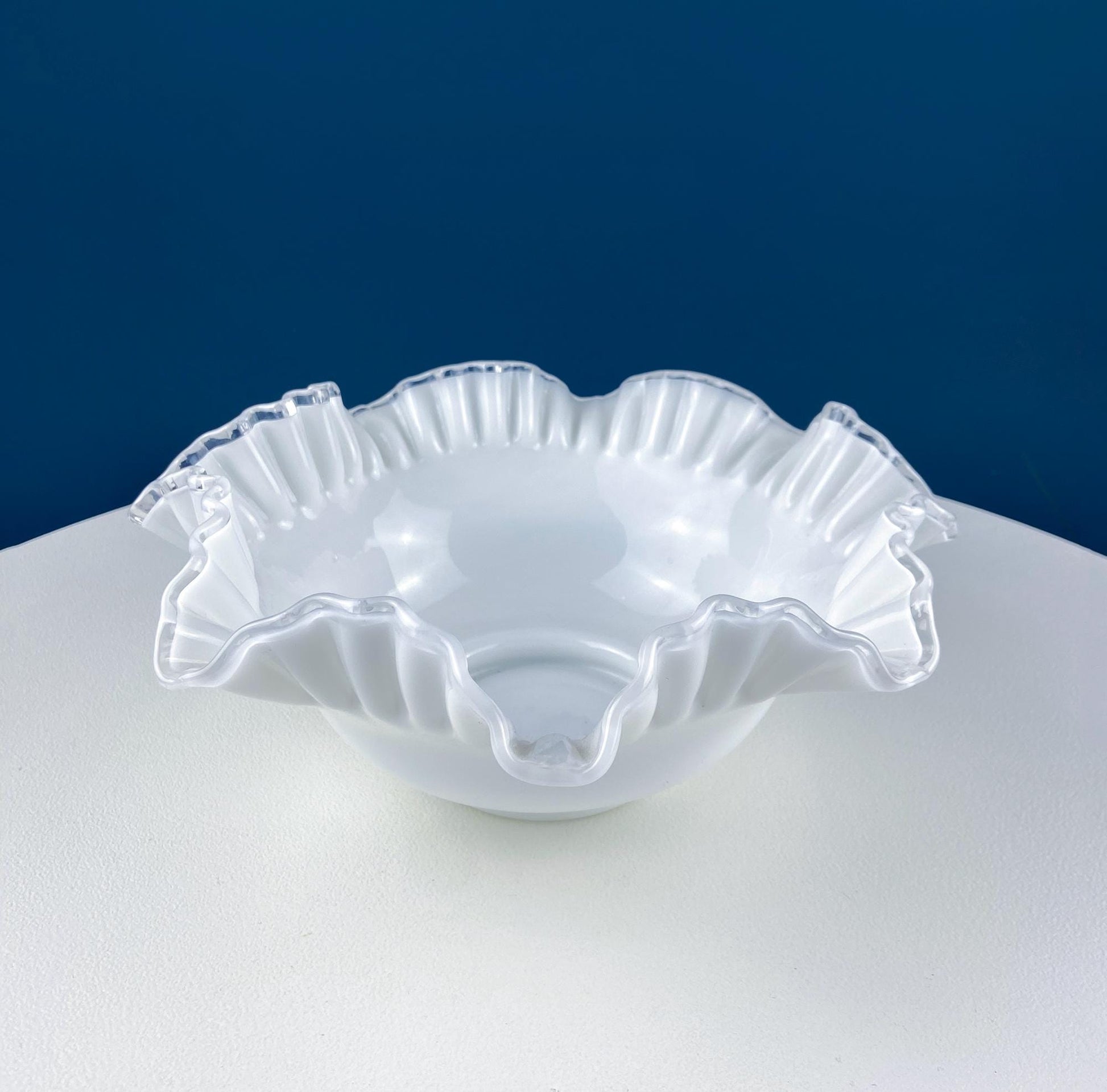 Silvercrest Bowl with Ruffled Edge. White Glass Fruit Bowl or Serving Dish with Clear Brim. Table Centerpiece. Serviceware. Wedding Gift.
