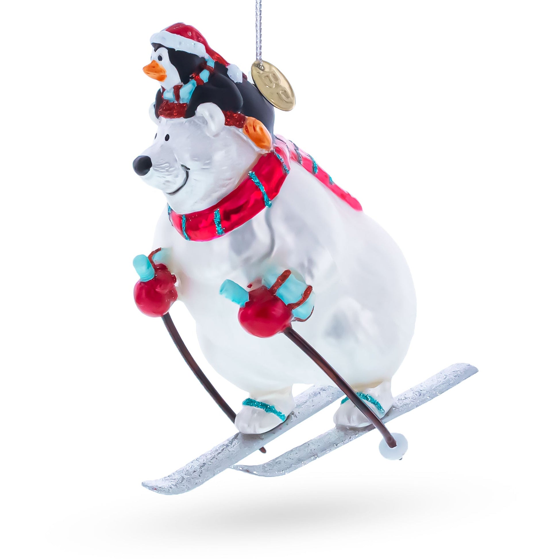 Skiing Polar Bear with Penguin Glass Christmas Ornament