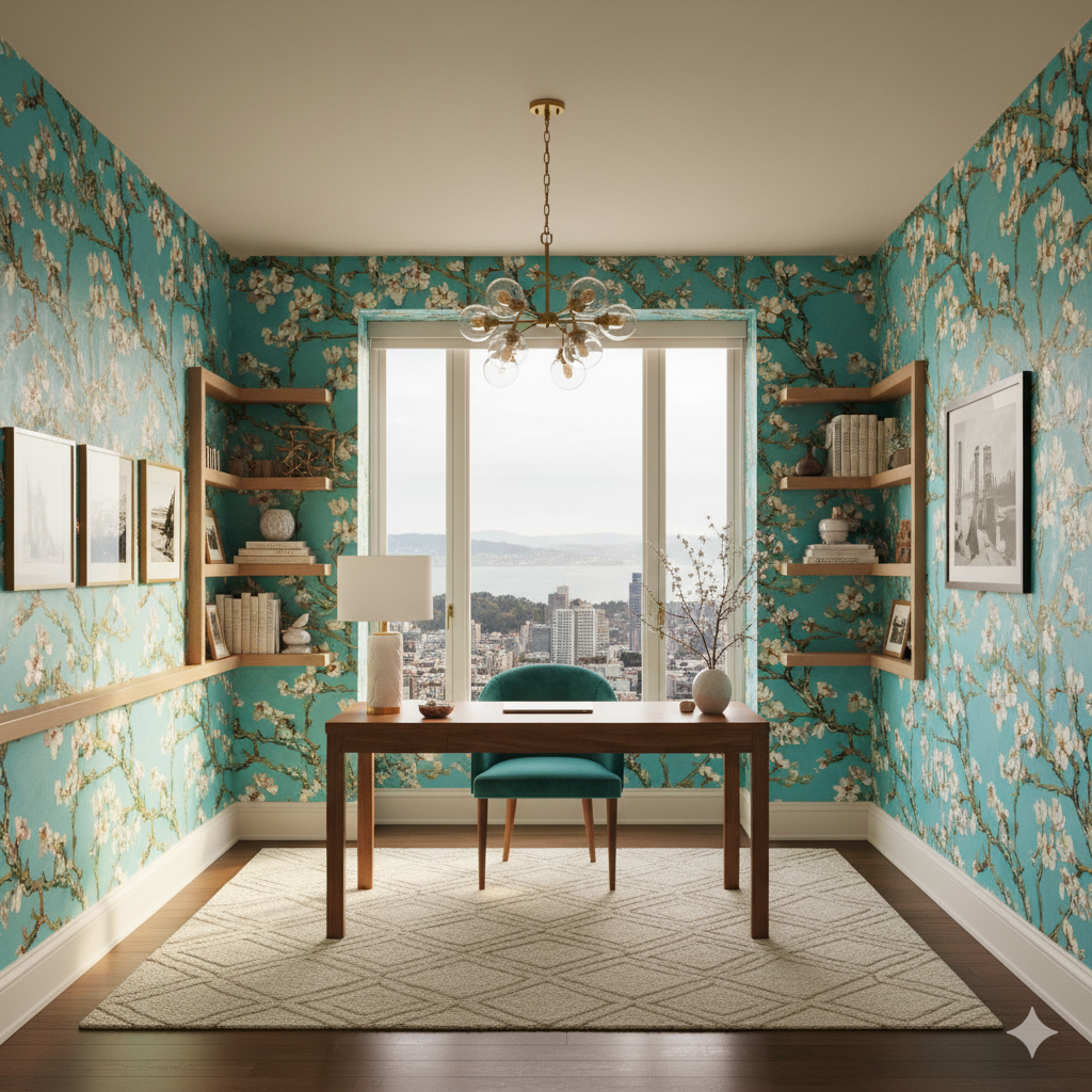 Branches of almond trees stretch across a sky of pure cerulean, dotted with pale white blossoms edged in pink. The confident brushwork captures fragility in motion, balancing lightness with artistic intensity. This design is perfect for airy living rooms, nurseries, or minimalist spaces craving a sense of openness. It complements Scandinavian wood tones, white furniture, and clean-lined interiors.