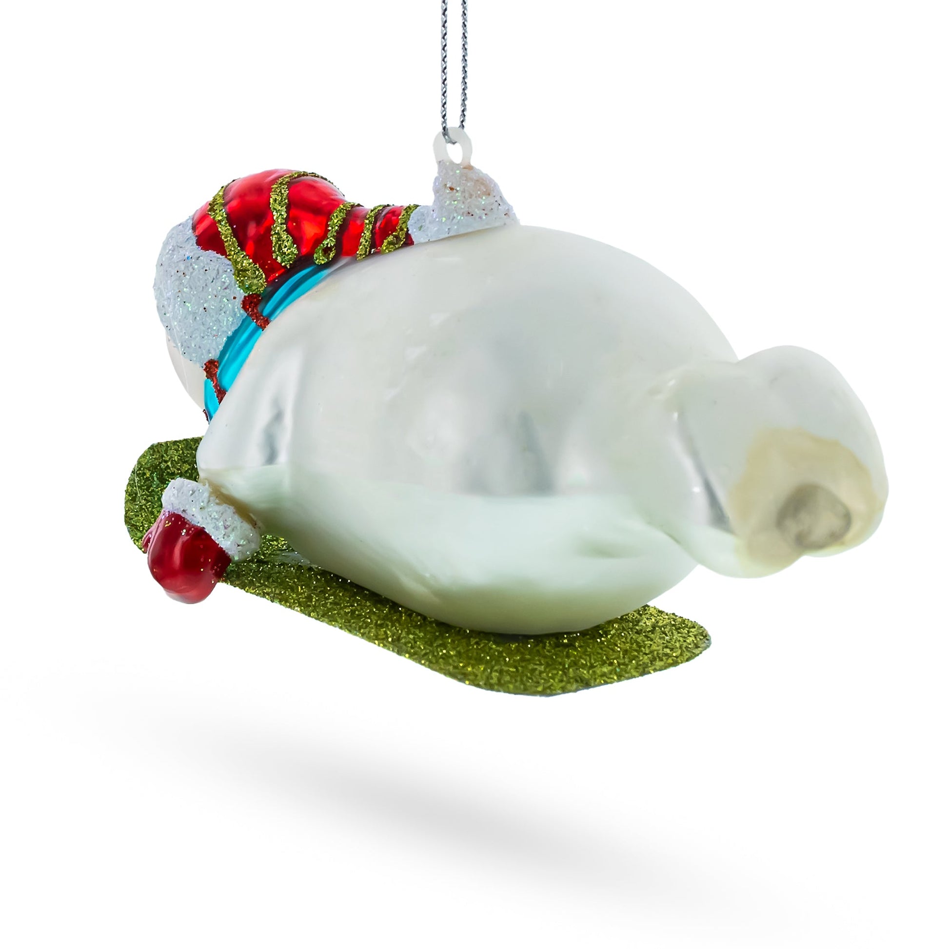 Snowman Gleefully Riding a Sled Glass Christmas Ornament