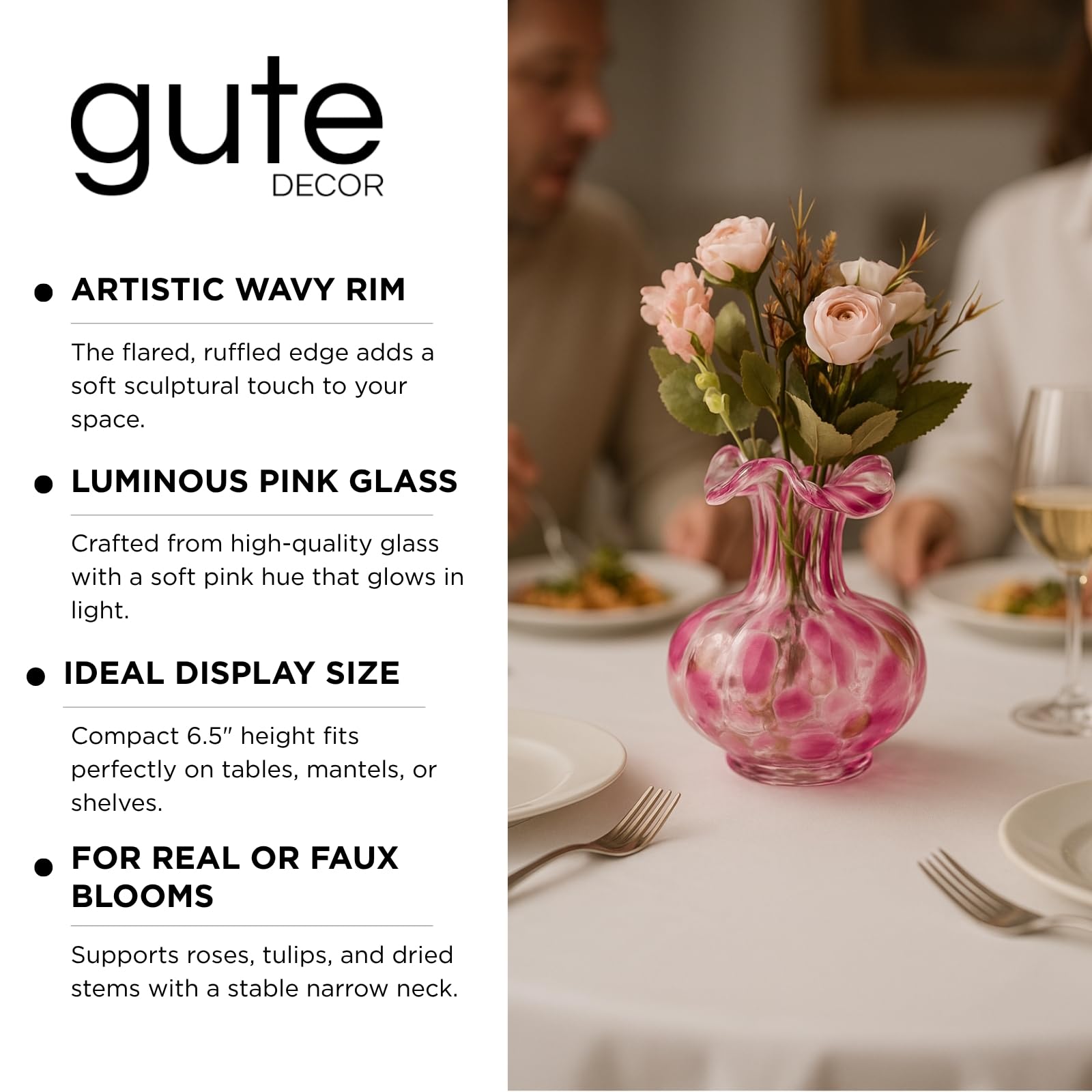 Bring elegance to your space with this pink glass vase, a sakura-inspired bud flower holder featuring a ruffled rim and soft, curved silhouette. Its translucent finish and cherry blossom style add a gentle glow, perfect for spring centerpiece or romantic tabletop decor. Measuring 6.5 inches tall and 4.33 inches wide, this small yet versatile vase fits effortlessly on mantels, shelves, or coffee tables. Ideal for both fresh and faux floral arrangements, it offers a beautiful way to display roses, peonies, or dried blooms. The clear artisan design blends vintage and modern aesthetics, making it a graceful home accent and a thoughtful gift for weddings, brunches, or any special occasion.