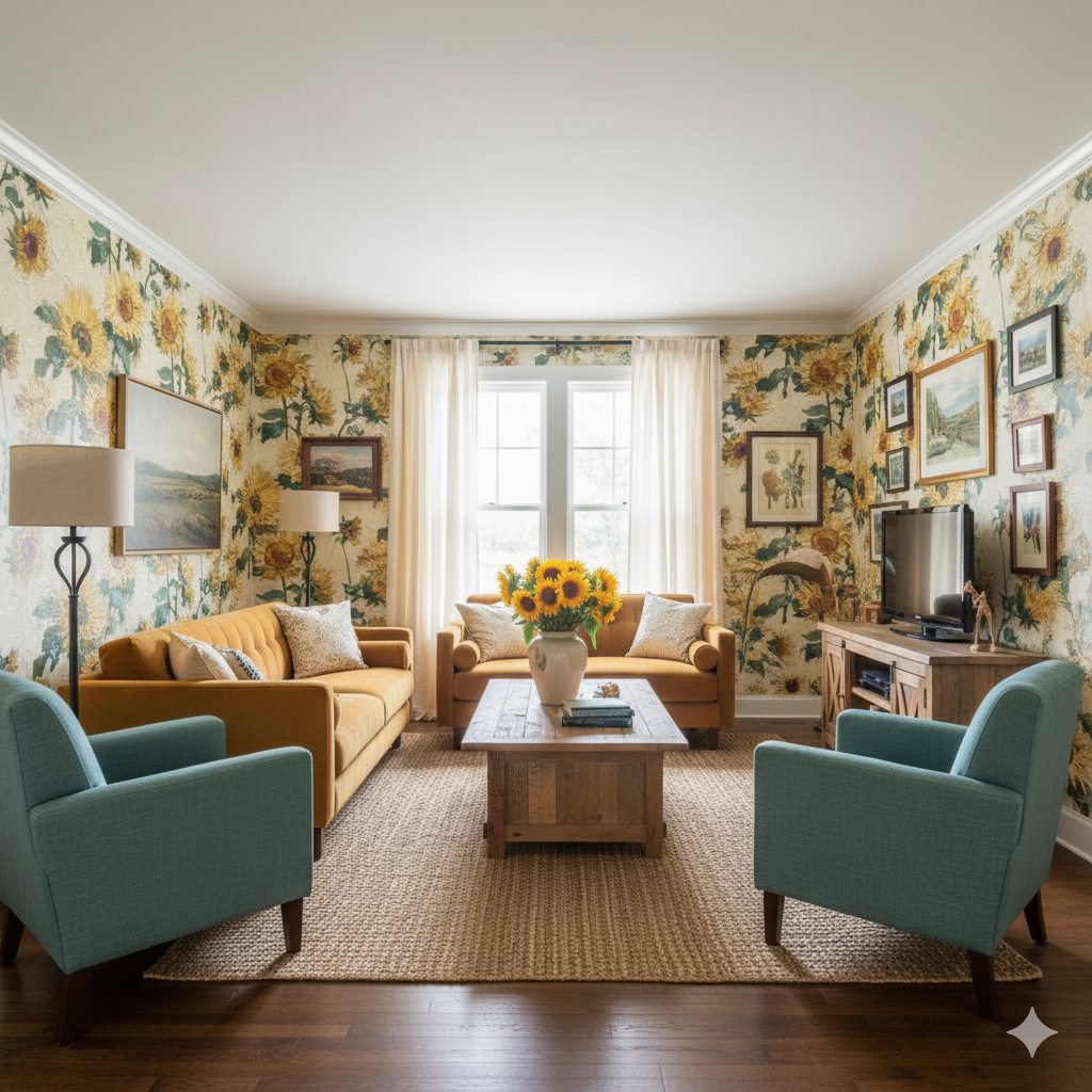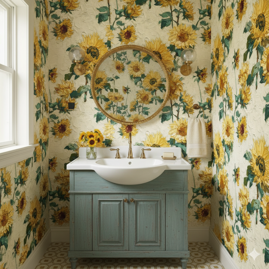 This bold sunflower design feels alive with the expressive brushwork of Post-Impressionism. Each bloom, painted in thick golden strokes against a textured cream backdrop, radiates warmth and rustic charm. The palette of yellows, ochres, and earthy greens recalls countryside summers and Van Gogh’s iconic works. Perfect for kitchens, sunrooms, or creative studios, this wallpaper brings energy and brightness while maintaining a painterly sophistication. It pairs beautifully with terracotta flooring, rustic wood furnishings, or even modern white cabinetry for contrast.