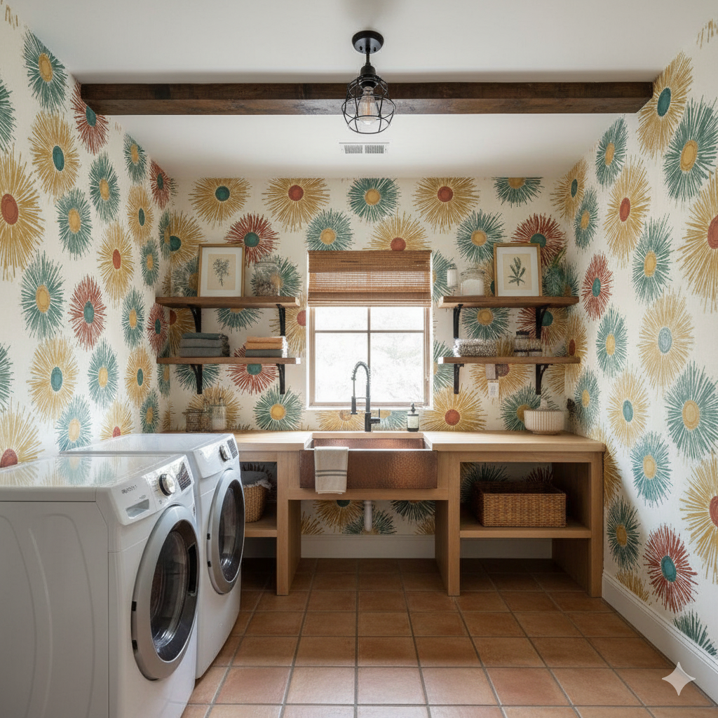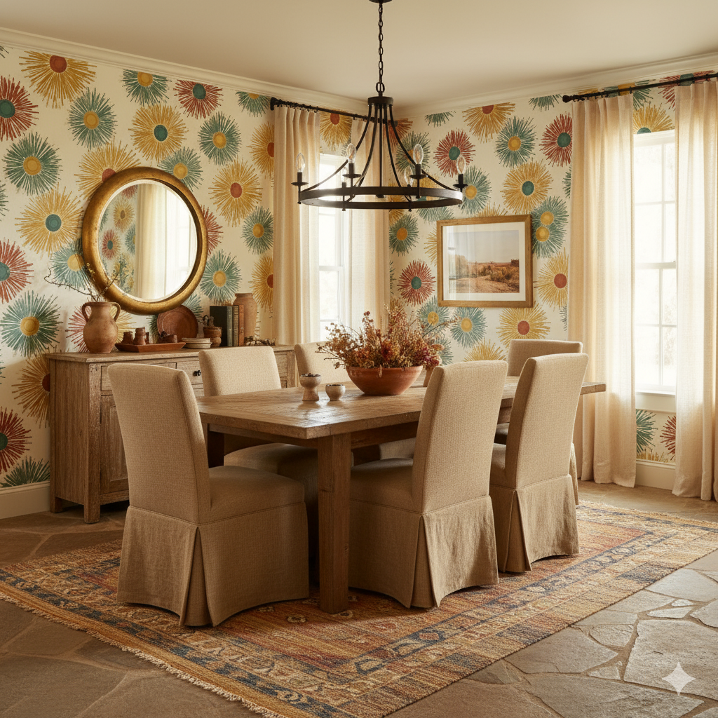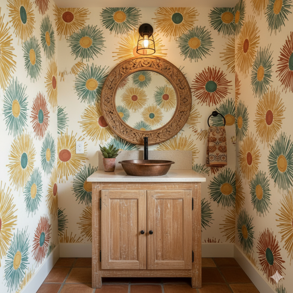 This vibrant wallpaper features oversized sunburst motifs radiating outward in fiery tones of ochre yellow, sage green, and burnt clay red. Each circle bursts with energy, painted in hand-drawn strokes that bring a lively, kinetic texture to the design. The cream background softens the boldness, making it versatile while still eye-catching. Perfect for eclectic living rooms, creative studios, or accent walls in a child’s playroom, this pattern balances mid-century modern flair with playful bohemian character. It works especially well in spaces where you want a bold focal point that feels warm, optimistic, and full of movement.