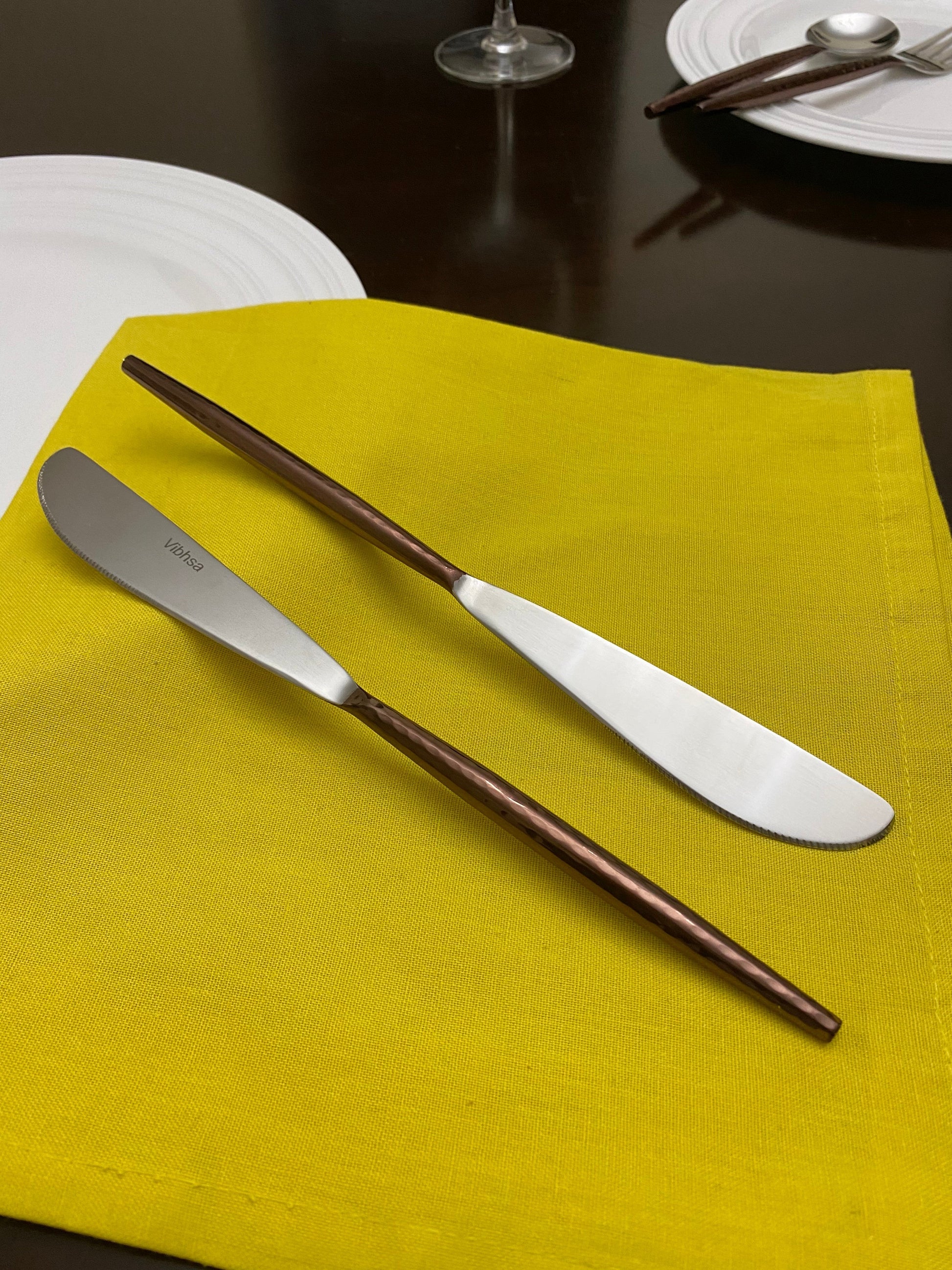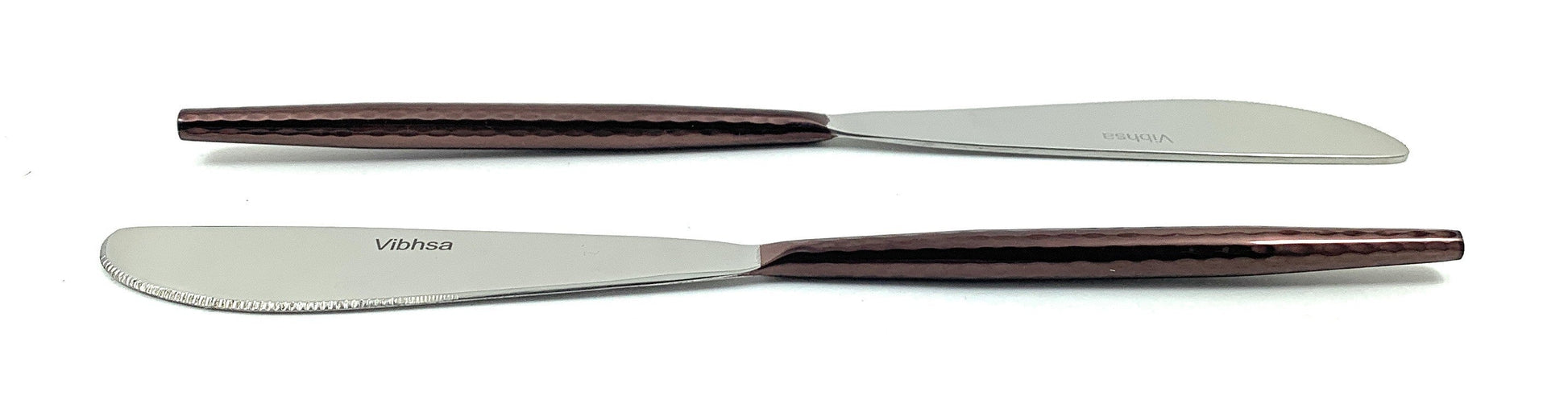 Vibhsa experiences you the best flatware designs for your tableware which attracts your guests on a dinner table. Set includes table setting for 6. 6 Dinner knives (9”x0.6”x0.7”). This Luxury Flatware will heighten the level of sophistication of your table setting. High-quality Thickener Stainless Steel