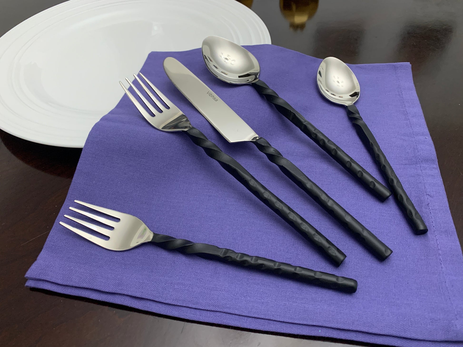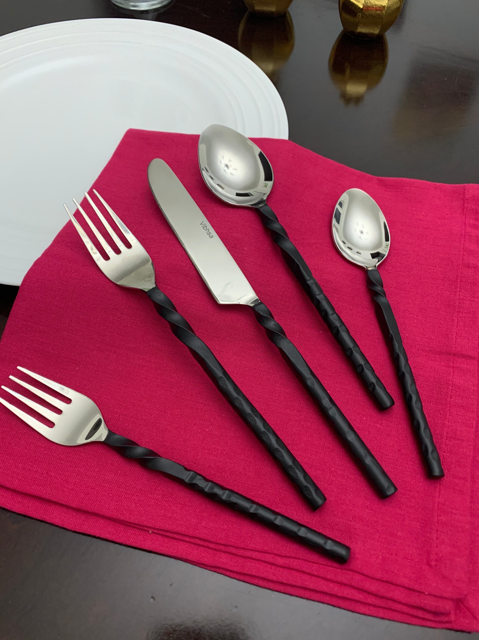 The Silverware set includes 4 pieces of each: 8.2” Dinner Fork, 9.3" Dinner Knife, 8.1" tablespoon, 7.1" Teaspoon and 7.2" salad forkHandmade Design with elegant finish. Silver shiny mouth with black twist handles. Comes in a gift box. Give a Status, Style, and Luxurious look to your dining experienceBecause of it's elegant design, it won’t hurt your hand while eating or use the utensils to serve food and clean them properly. Each handle is designed to help you to hold the varying sizes of cutleries with comfort.This product has smooth shine finish that looks elegant and enhance the beauty of your dining table settings with this luxurious flatware set.The perfect addition to your formal dinner settings and for special occasions, this shiny collection will provide you with a level of sophistication that is unparalleled. Our flatware set will make your dinner table a center of attention.Our elegant cutlery makes the dinner table setting more formal and elegant. From place setting to special occasion flatware sets, these beautiful pieces are of excellent craftsmanship.Add an extra touch of sophistication and elegance to your dining table settings with this Vibhsa flatware set. When it comes to spending quality time with your family and friends, a good dining experience never fails.