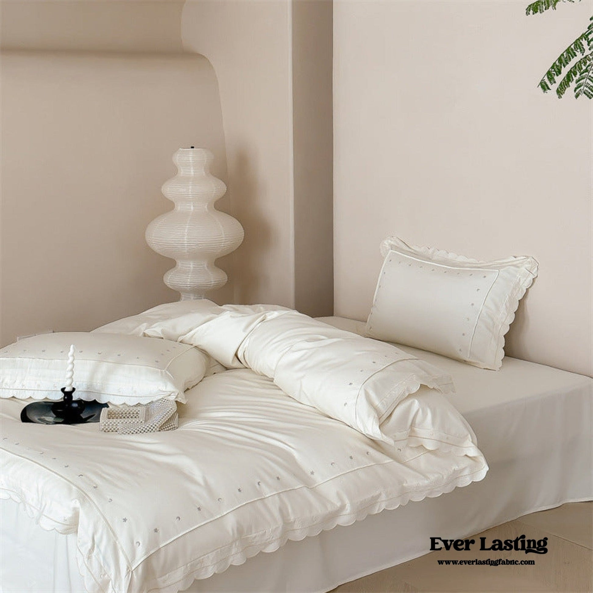 Transform your bedroom into a celestial sanctuary with our Star Gaze Short Cake Ruffle Bedding Set. Crafted with celestial inspiration, this bedding set invites you to dream under the stars in a cloud of softness. The short cake ruffles add a whimsical touch, creating a magical escape within your own space. Immerse yourself in the allure of the night sky and indulge in the sweet embrace of this luxurious bedding set. Each duvet cover is equipped with four corner ties and a hidden zipper to ensure your duvet insert stays securely in place all night. Elevate your sleep experience with celestial elegance, and let the Star Gaze Short Cake Ruffle Bedding Set become the focal point of your dreamy retreat.