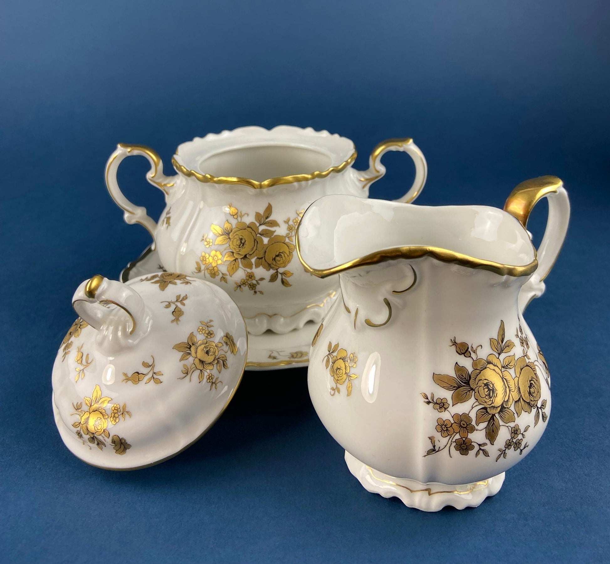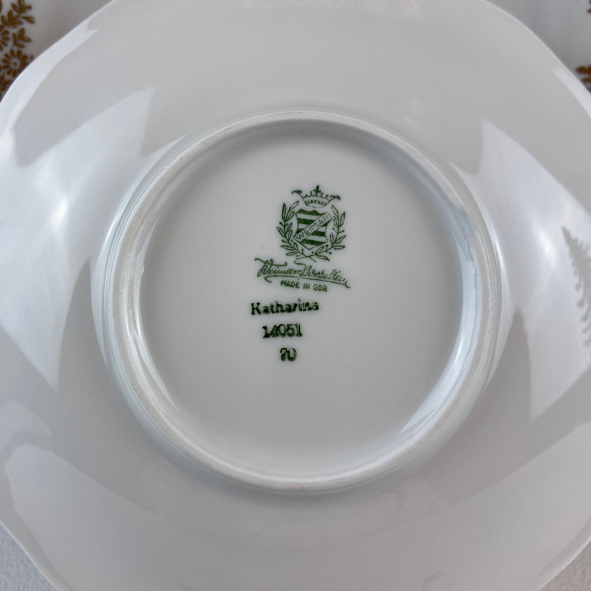Stunning Antique White and Gold Tea Set Trio. Weimar Porcelain, Katharina Pattern. Made in GDR. Hand Painted Floral Gold Trim. Dining Room Decor. Excellent Condition. No Gold Loss. Marked by the Manufacturer.