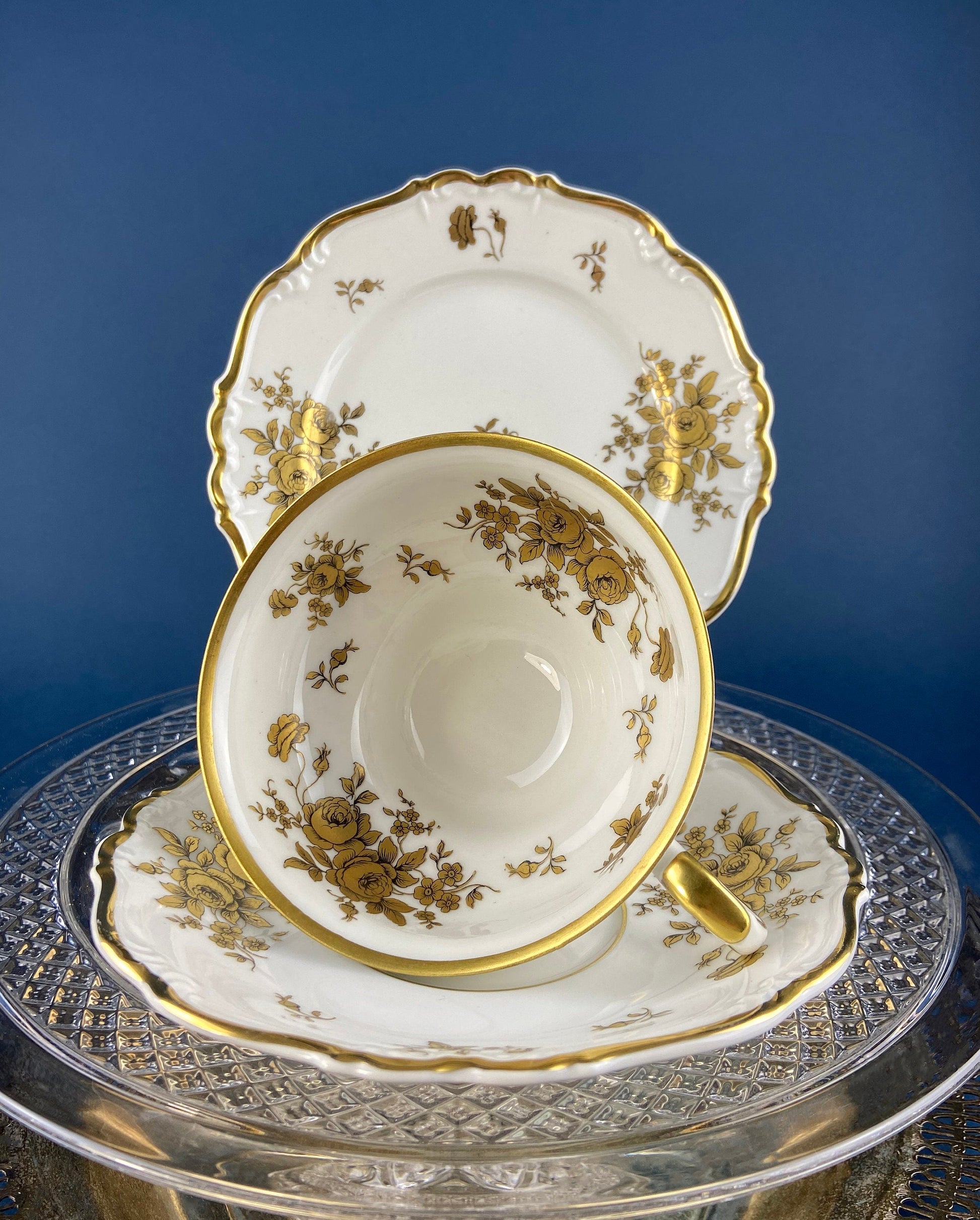 Stunning Antique White and Gold Tea Set Trio. Weimar Porcelain, Katharina Pattern. Hand Painted Floral Gold Trim. Dining Room Decor.