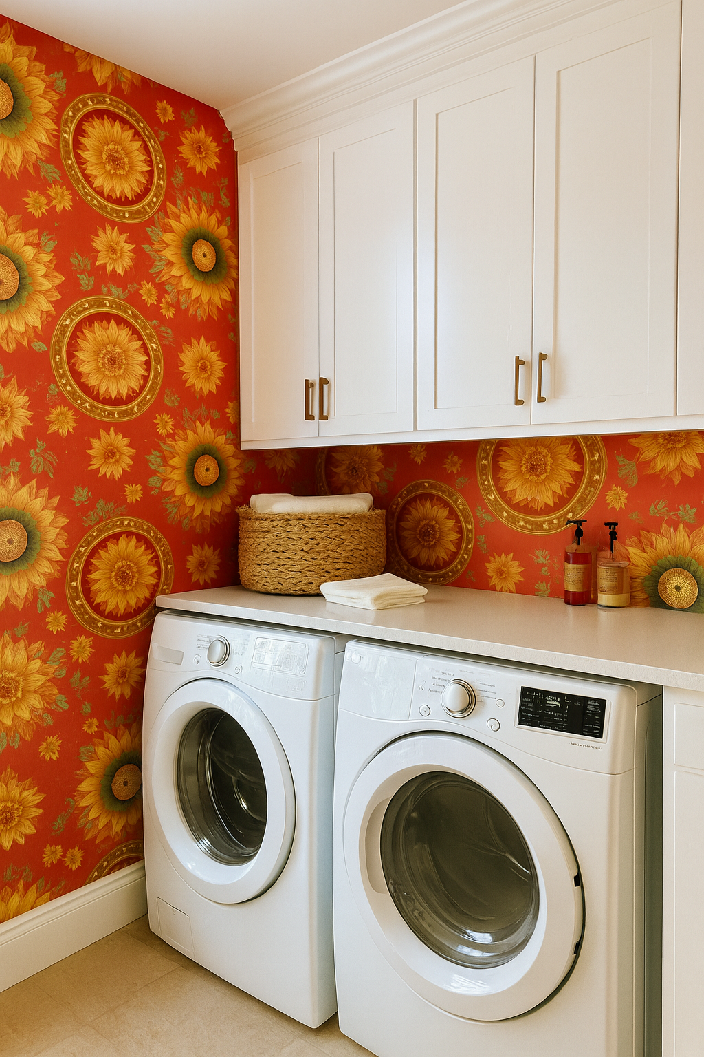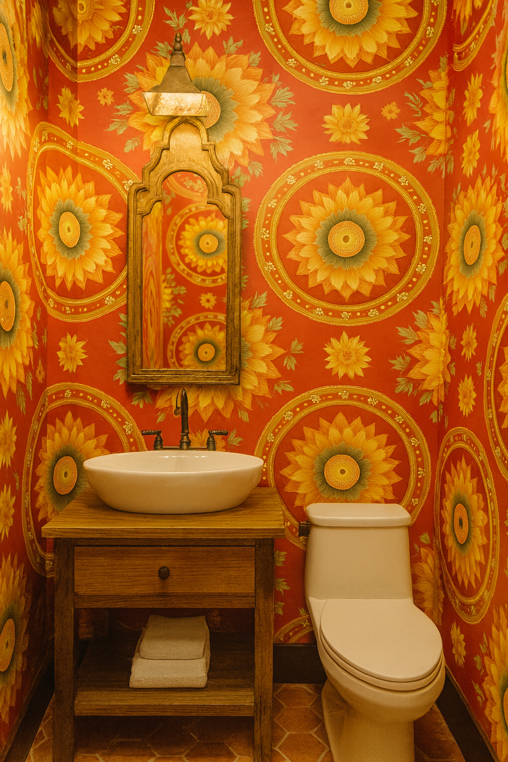 “Sunburst Sonata” is a bold and radiant wallpaper featuring stylized desert sunflowers arranged into mesmerizing mandalas. Dominated by golden yellows, earthy oranges, and sage greens, the design bursts from a deep terracotta red background. Intricate floral motifs and radial symmetry give this piece a regal, almost celestial quality. Ideal for accent walls, dining areas, or creative studios, this pattern infuses warmth, vibrancy, and cultural richness into any space seeking a Southwest or boho-luxe aesthetic.