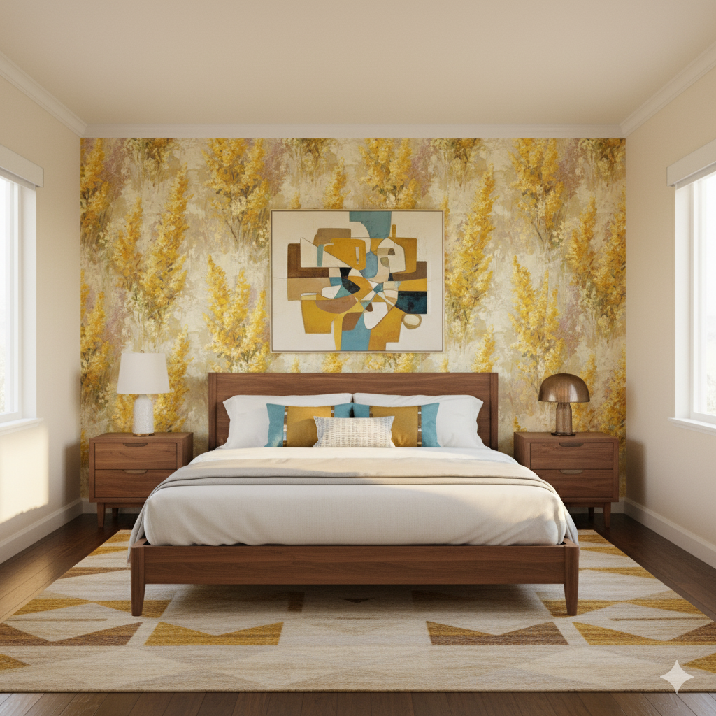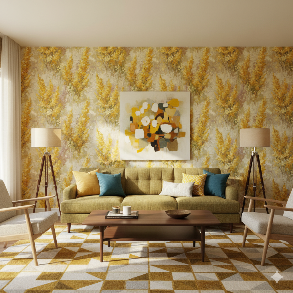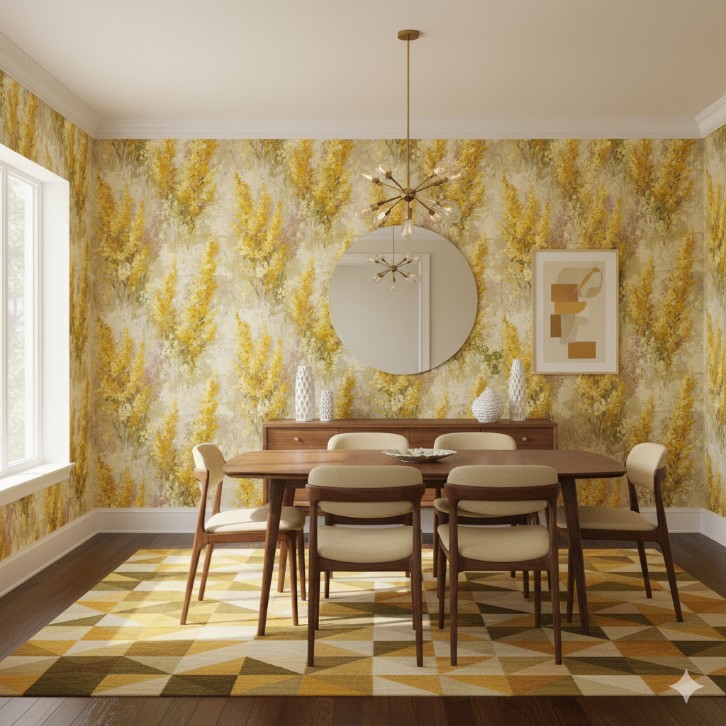"Sunflare Meadow" is a golden celebration of nature, featuring blooming goldenrod clusters rendered in painterly strokes of yellow, cream, and soft lavender undertones. Its warm neutral backdrop makes it a stunning choice for warm-toned interiors, country kitchens, and vintage-inspired parlors craving a burst of sunshine.