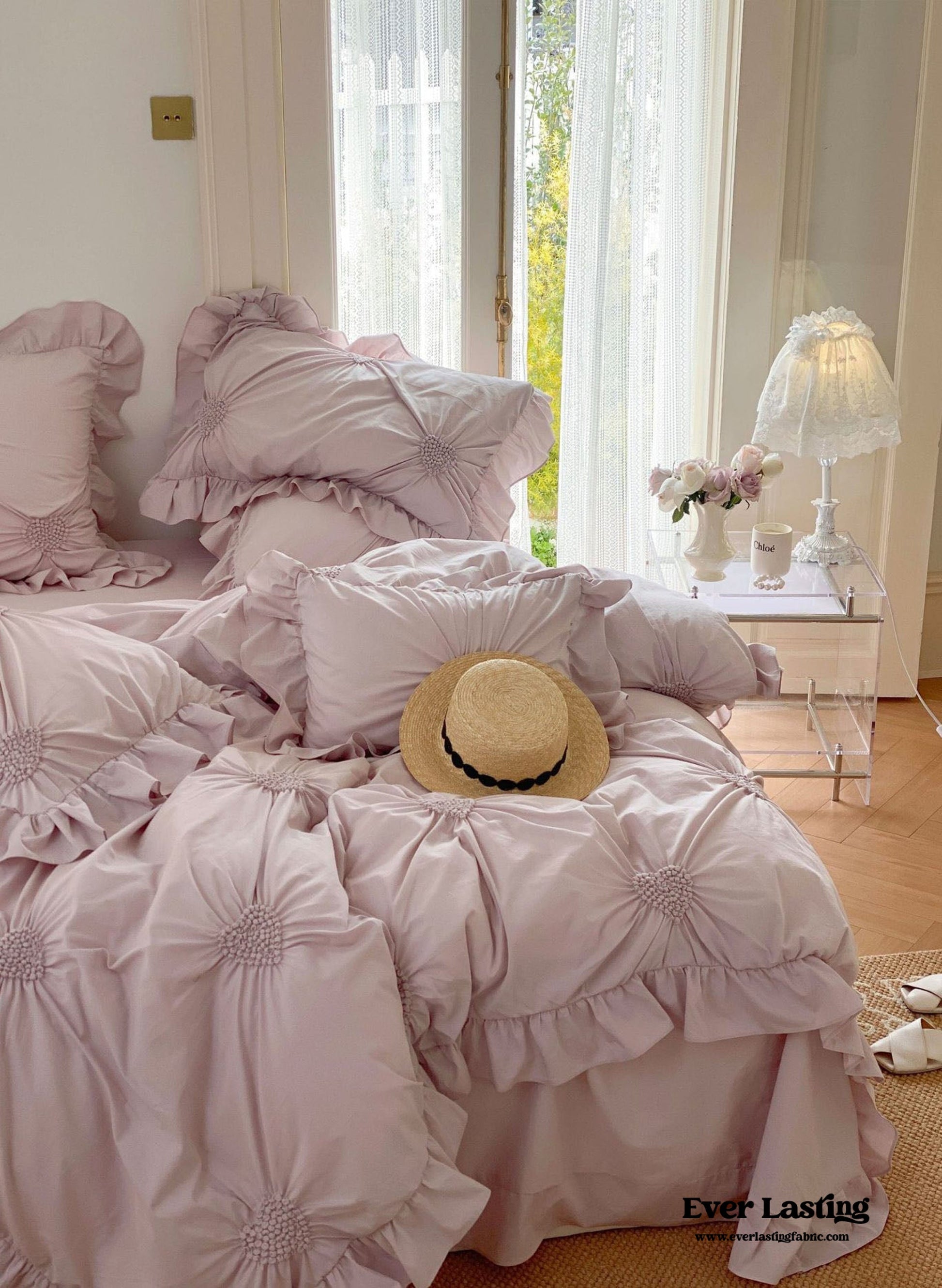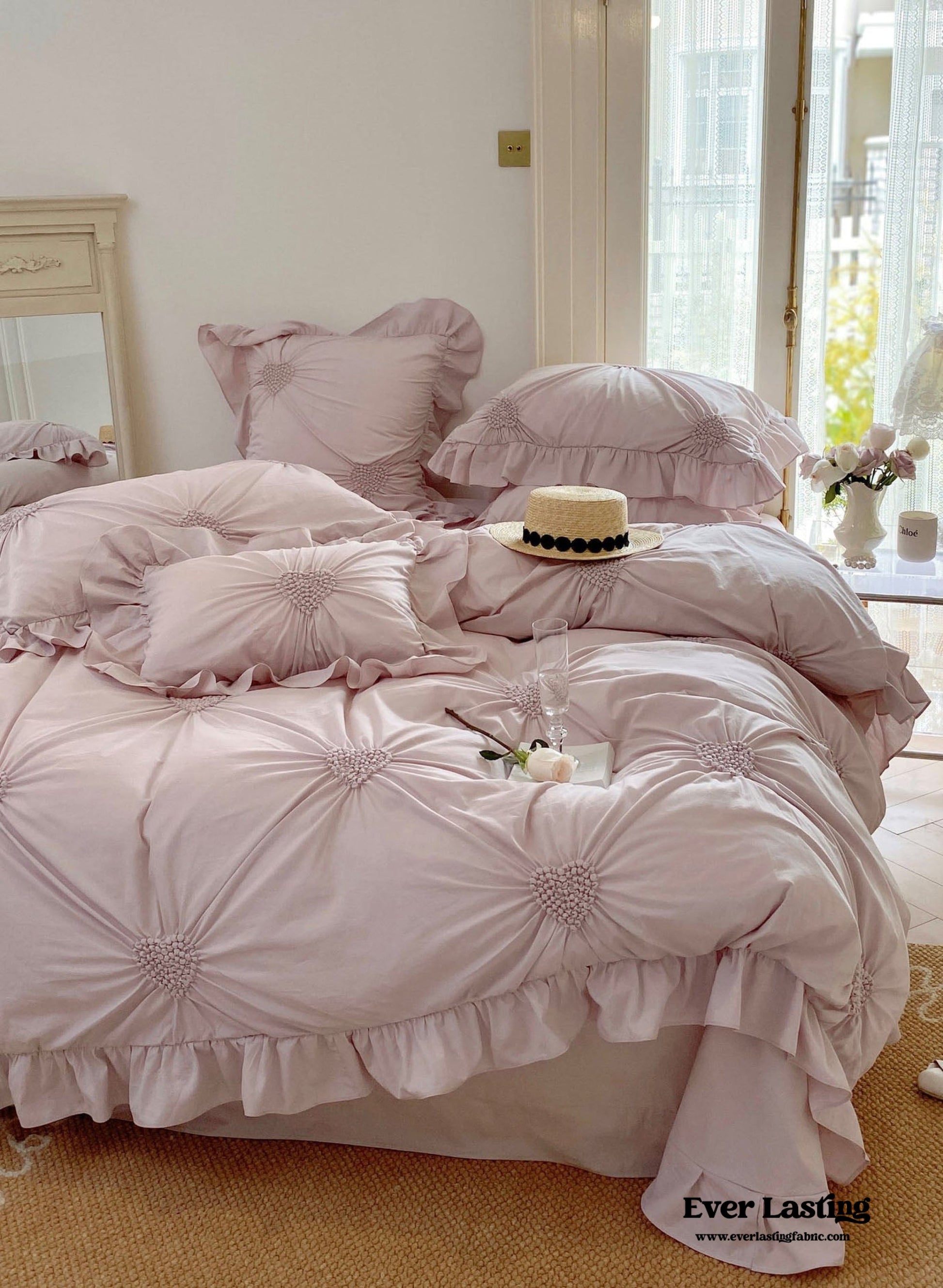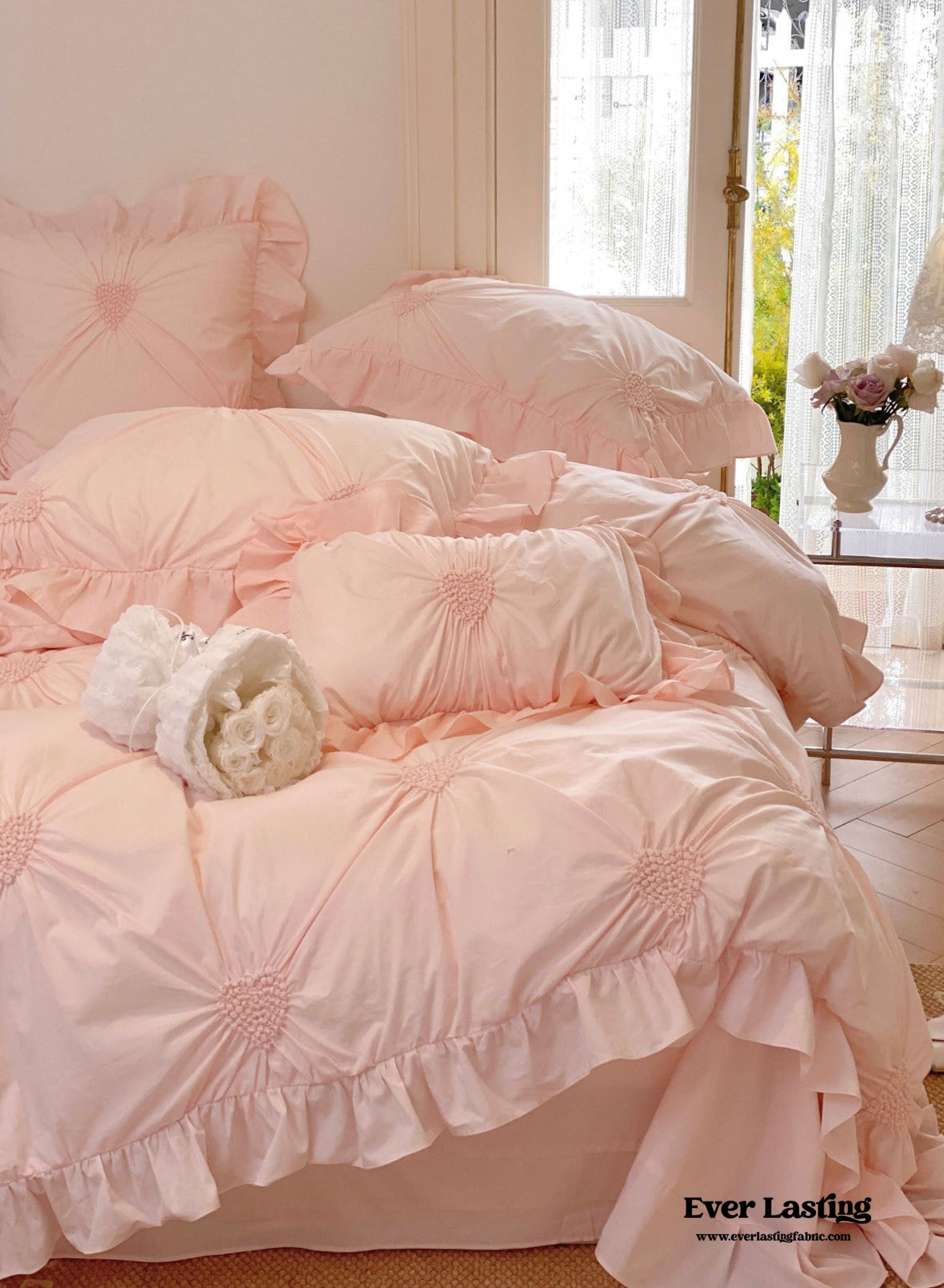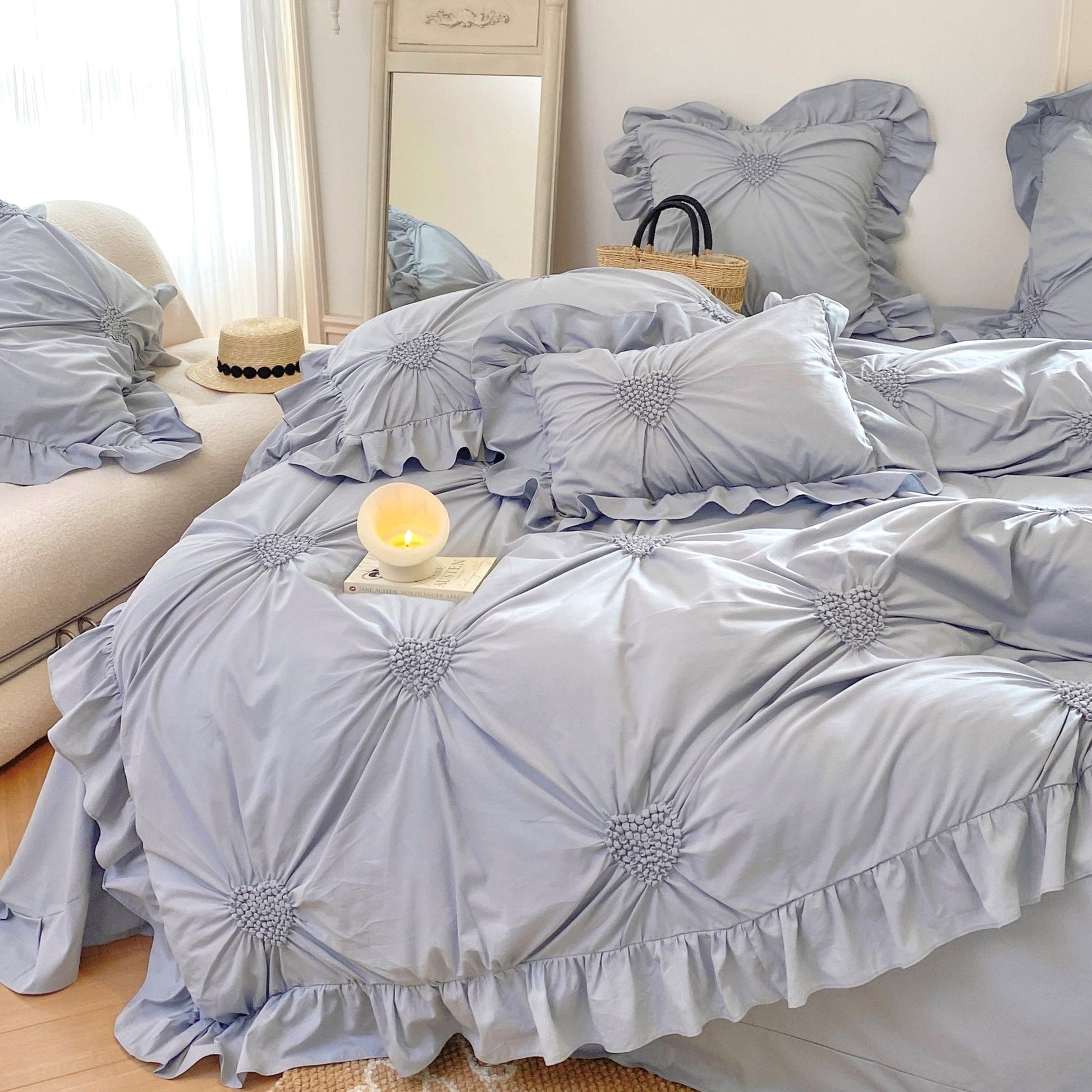 Introducing our Sweet Heart Embroidered Ruffle Bedding Set, designed to infuse your bedroom with a sweet and romantic ambiance. Crafted from luxurious 100S pure cotton, this four-piece set promises unmatched softness and comfort. The delicate heart-shaped embroidery adds a touch of love, while the ruffled edges exude an inviting charm reminiscent of a fairytale. Each duvet cover comes with four corner ties and a hidden zipper to keep your duvet insert in place all night long! This bedding set includes everything you need for a dreamy night's sleep. Dive into a world of comfort and style, where every detail is designed to create the perfect sleeping environment. Transform your space into a sweet sanctuary with our Sweet Heart Embroidered Ruffle Bedding Set, perfect for those who adore a touch of romance in their decor.