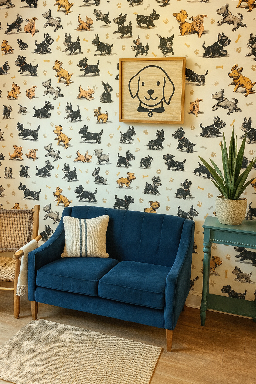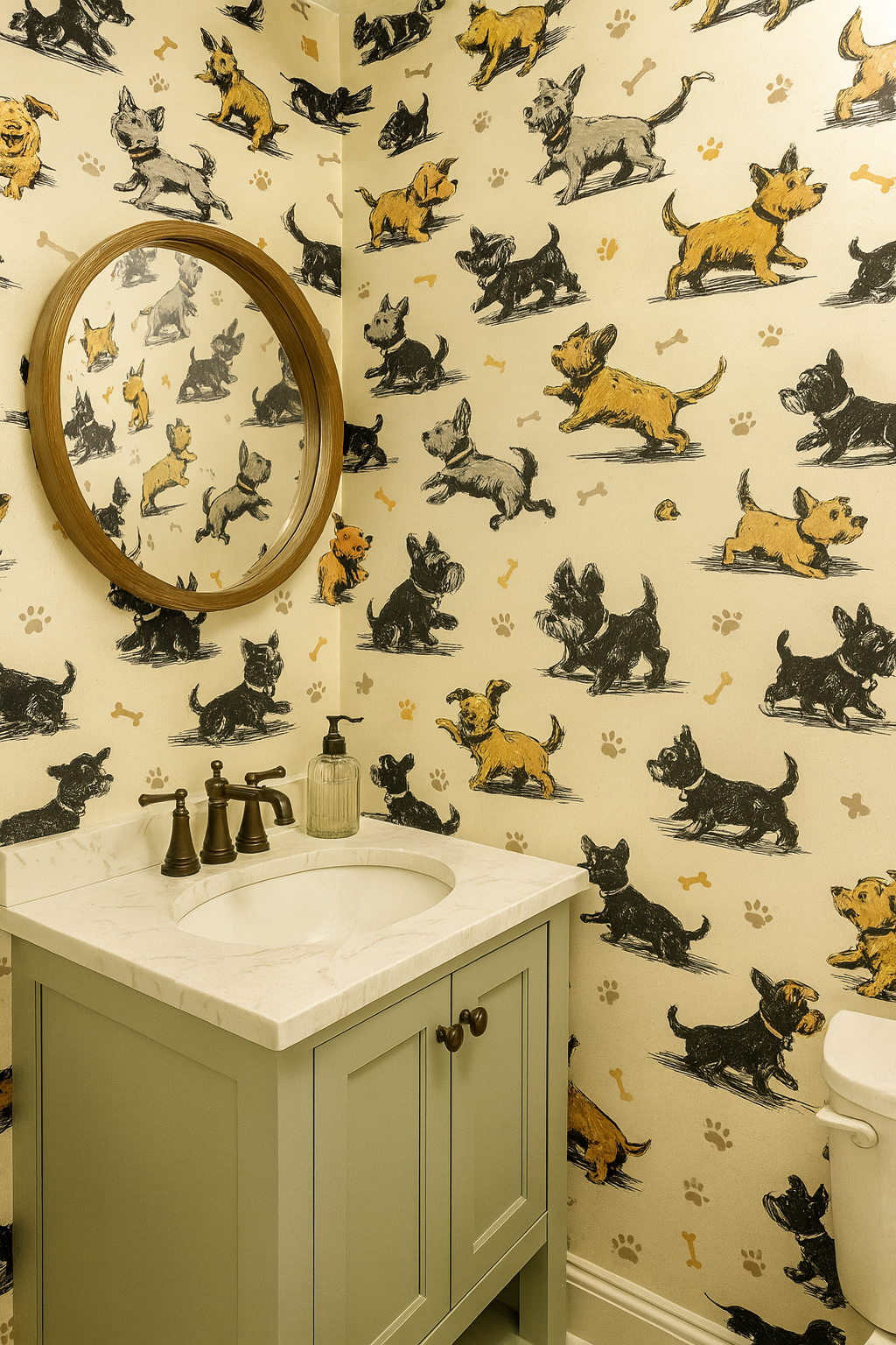 Lively terriers, dachshunds, and playful pups dash and prance in a vintage sketch style across this animated print. Rendered in black, tan, dusty gray, and soft rust on a bone-colored background, these stylized dogs are punctuated by paw prints and scattered bones. A charming choice for pet boutiques, mudrooms, laundry spaces, or any dog-lover’s den.