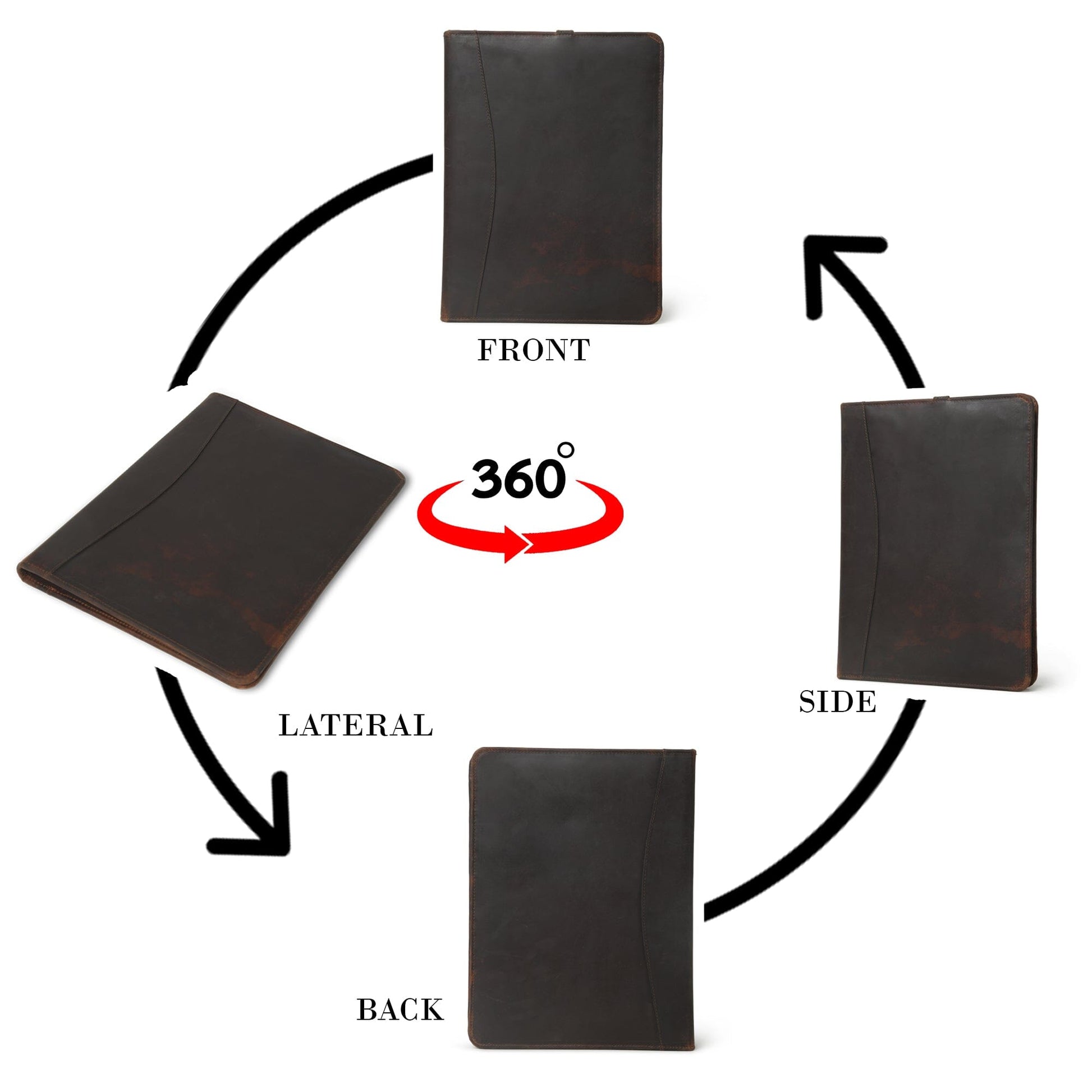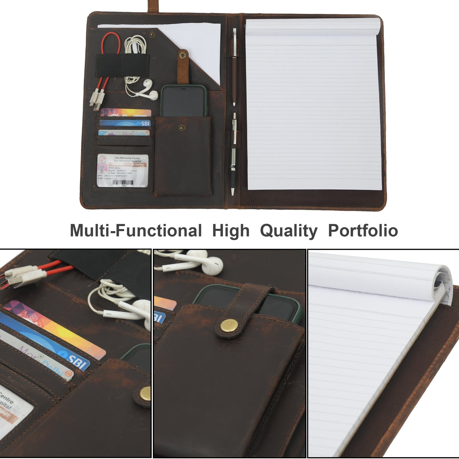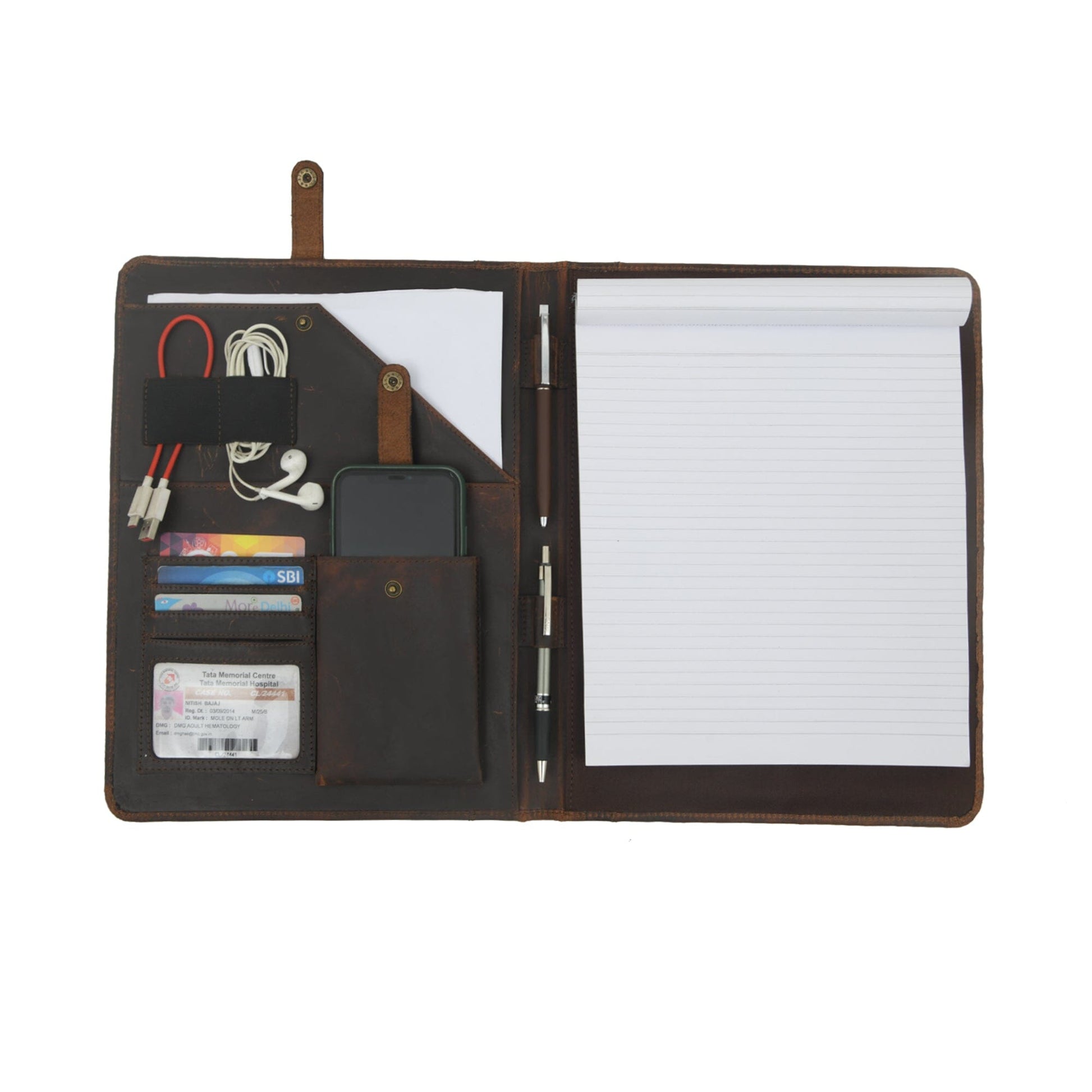 This beautiful leather padfolio and legal portfolio document holder is a compact organizer to keep your stuff and notepad. There are slots for mobile phones, cards, pens, charging cables, and earphone cords. Practical and well-organized for your daily gadgets.