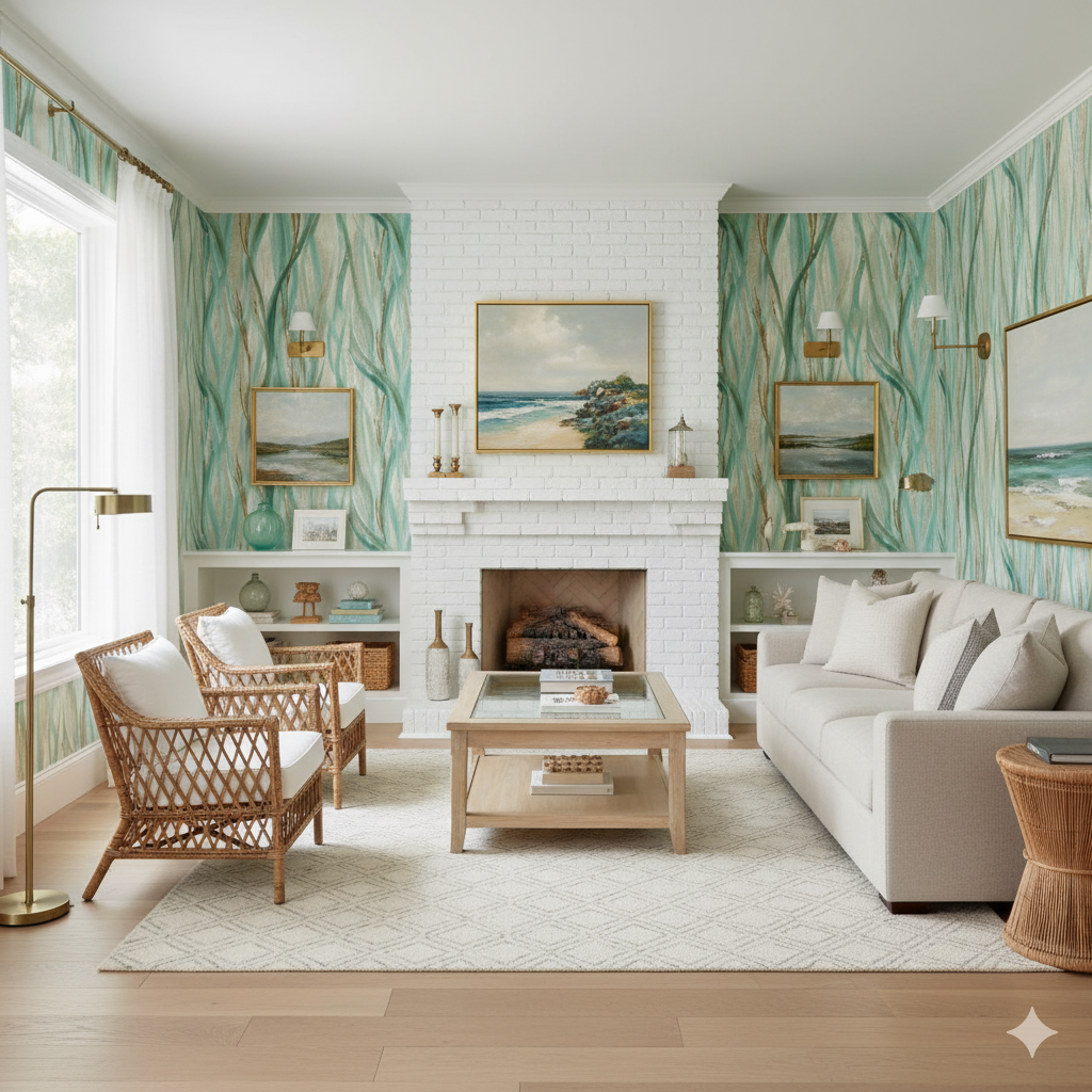 This design feels alive with movement, as vertical strands of seagrass sway in painterly strokes of teal, aqua, sage, and sandy beige. Layered textures and hand-painted energy capture the impression of waves rolling across a coastal dune. Tidegrass is ideal for beach houses, spa-like bathrooms, or open-concept living areas where a sense of fluidity and rhythm is desired. Its vertical pull elongates walls, giving small spaces a taller, breezier presence. A natural fit for interiors seeking to echo coastal escapes and airy, sunlit horizons.