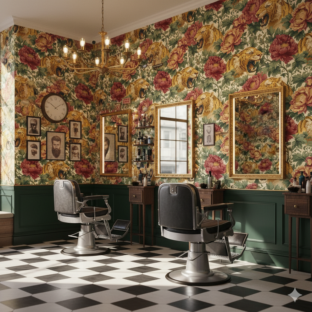 Snarling tigers with fierce expressions emerge among enormous crimson peonies and leafy green foliage, creating a dramatic and almost mythical composition. The design merges the ferocity of wildlife with the elegance of traditional florals, resulting in a bold, story-rich pattern. Perfect for feature walls in dining rooms, eclectic living rooms, or fashion-forward commercial spaces, this wallpaper commands attention. It suits interiors seeking drama and impact, particularly in eclectic, maximalist, or East-Asian inspired design schemes.