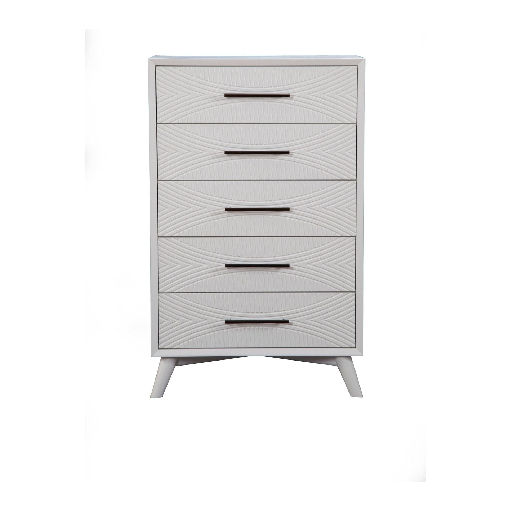 Classic White finish. Quality crafted with Mahogany Wood Solids & Veneer. Fully assembled. French & English Dovetail drawer construction. Felt lined top drawer(s). Ball bearing metal drawer glides. 5 drawers for storage. Alpine Furniture knows that certain things never go out of style. Their furniture products are designed and constructed with classic English and/or French dovetailing that provides a sturdy result and an unbeatable aesthetic. For over 20 years, Alpine has provided its customers with a variety of wood products for the bedroom, dining room, and living room. Each piece is designed to meet the highest-quality standards of design, durability, and dependability. Customer satisfaction is of the utmost importance to Alpine. They have altered their designs over the years based on customer input in order to attain excellence in all areas.