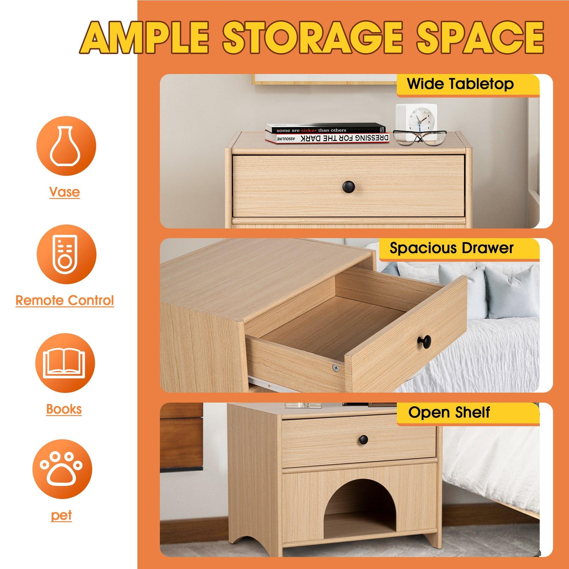 【Pet-Friendly Hideaway】 :Equipped with a spacious drawer and an open shelf, offering ample space to organize essentials, books, or décor while keeping items easily accessible.