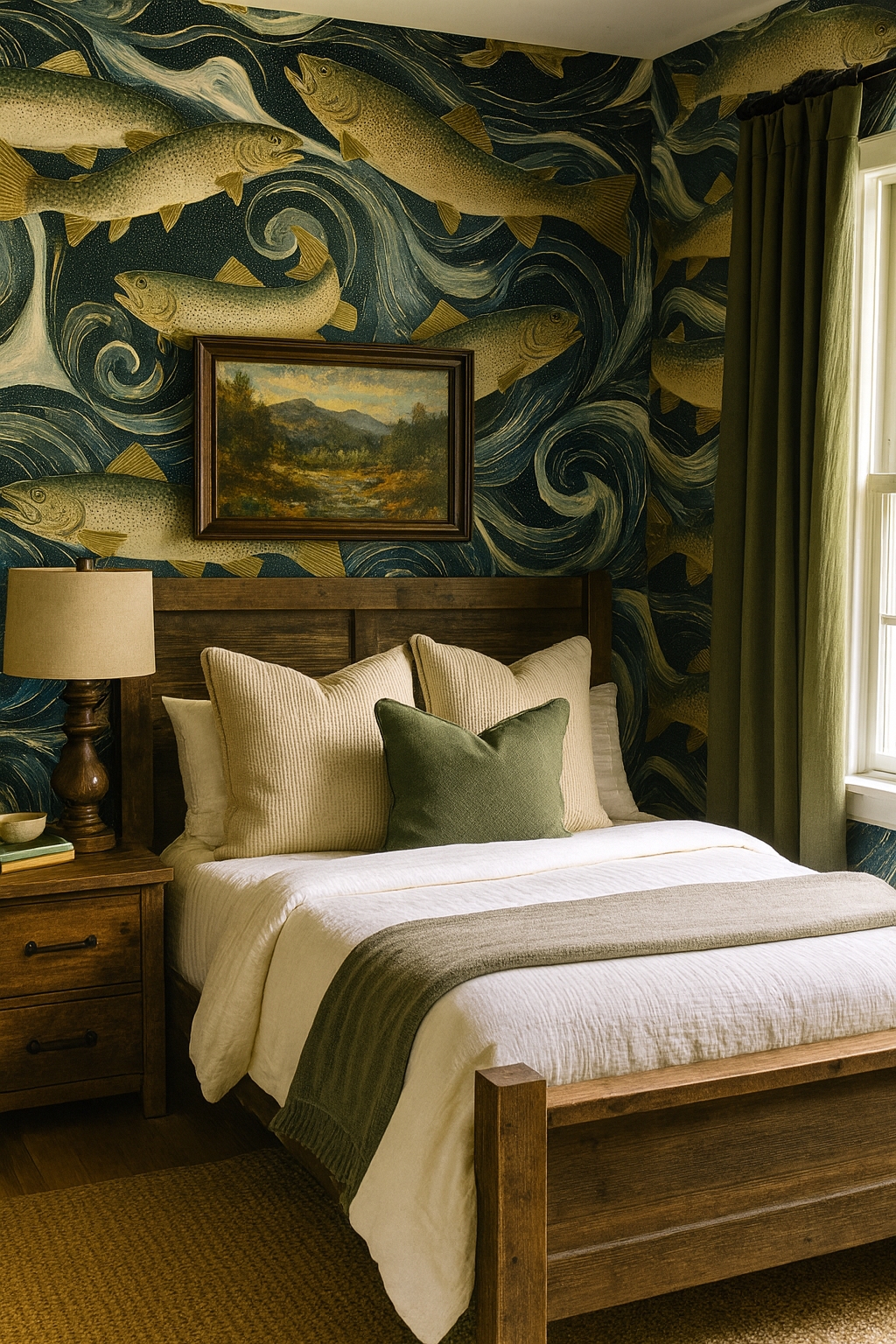Dive into movement with Trout Waltz, a swirling river scene of stylized trout painted with shimmering watercolor scales in greens and golds, set against an inky navy backdrop. With swirling currents and textured dot accents, it’s perfect for lake houses, fishing lodges, or bold masculine studies with a touch of whimsy.
