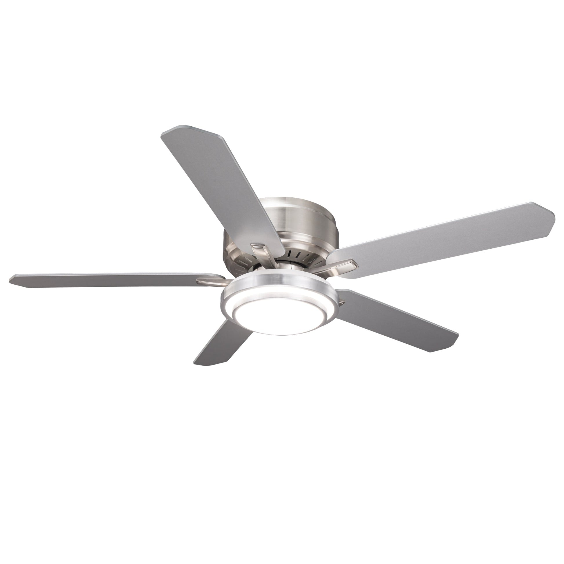 【Dual-Sided Industrial Design】: Features a 52-inch flush-mount profile with five reversible blades, offering a silver or wood-grain finish to match any industrial or modern decor.