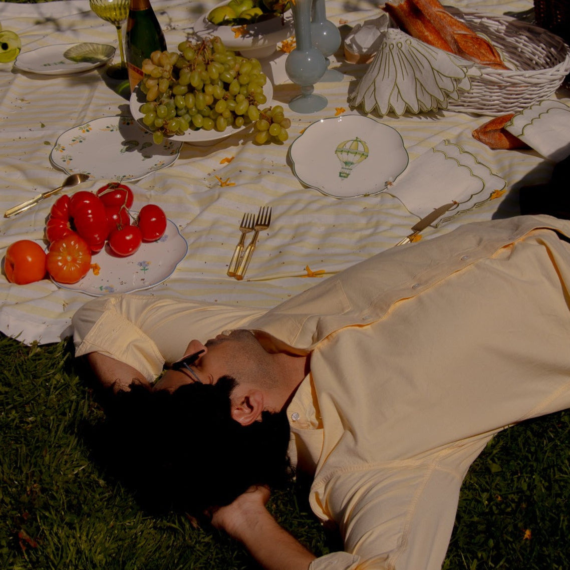 The Valensole Lavender Starter Plate encapsulates the essence of a dreamy afternoon in Provence with a hand-drawn hot air balloon in soft green and yellow tones and a muted green scalloped rim. Serving more than just appetizers, this plate promises a journey to the heart of the French countryside.