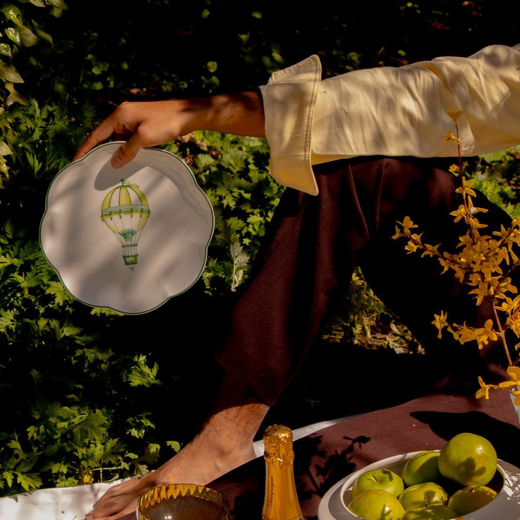 The Valensole Lavender Starter Plate encapsulates the essence of a dreamy afternoon in Provence with a hand-drawn hot air balloon in soft green and yellow tones and a muted green scalloped rim. Serving more than just appetizers, this plate promises a journey to the heart of the French countryside.