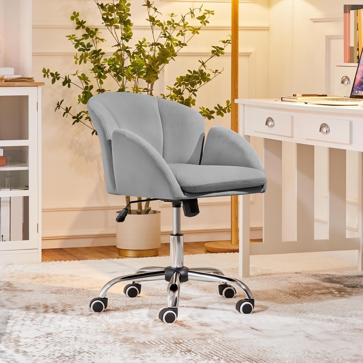 Elevate your space with a velvet desk chair that combines luxury, comfort, and everyday practicality. This light gray vanity chair for bedroom and home office wraps silky velvet in soft foam and rests on a sturdy chrome base, delivering a seating experience that feels as good as it looks.