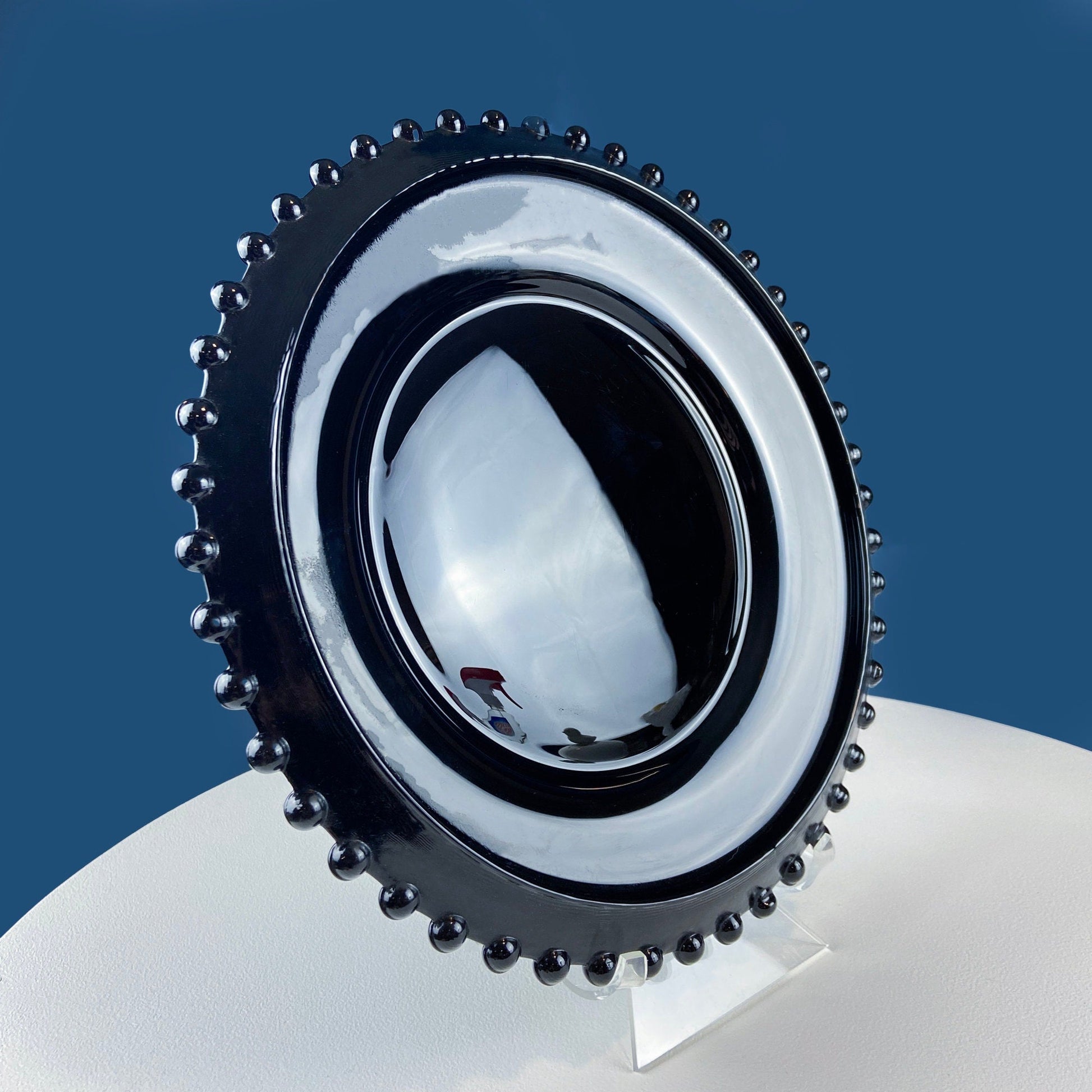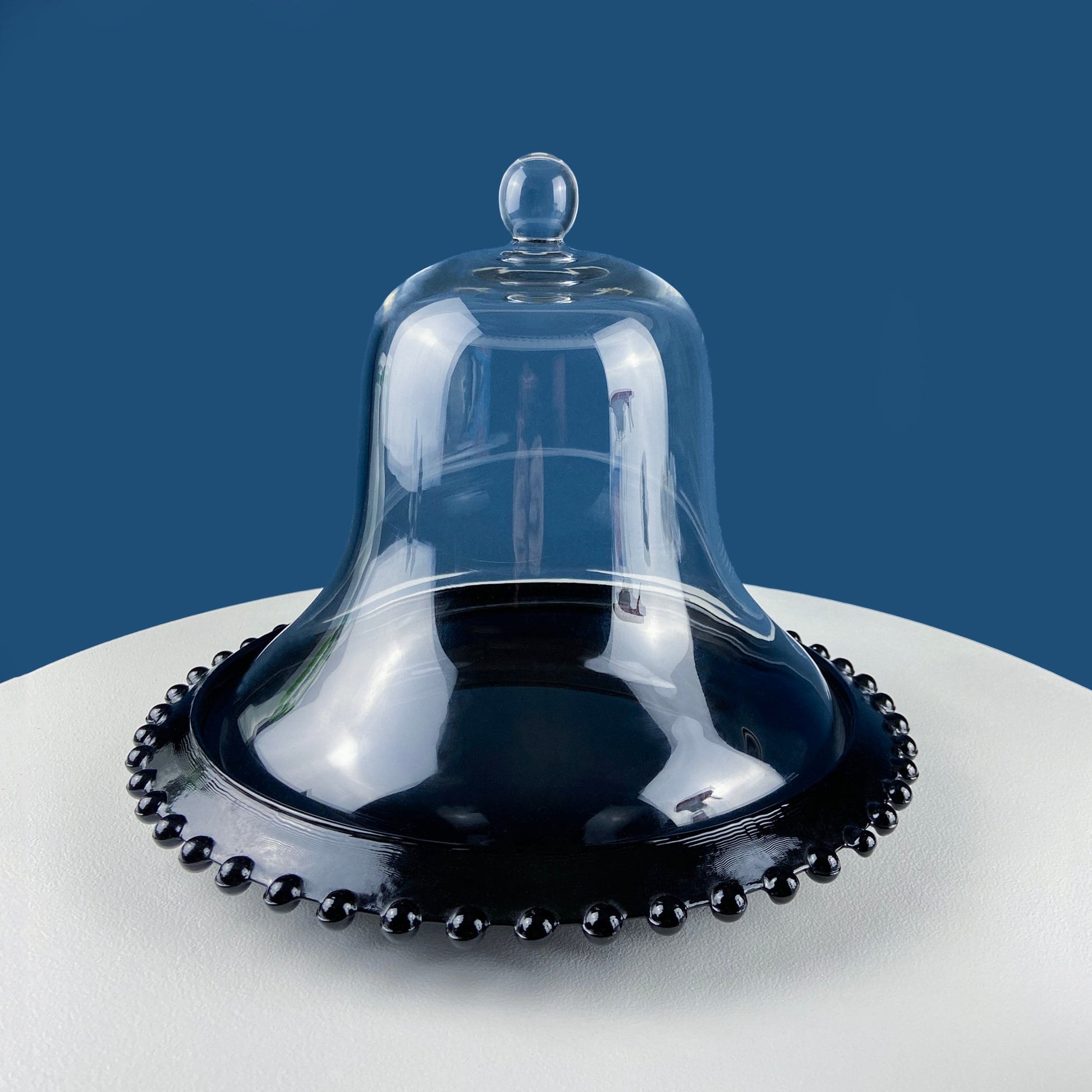 Vintage Black Milk Glass Serving Platter with Clear Bell Dome. Beaded Rim Black Amethyst Large Plate. Bell Dome. Home, Bakery, Cafe Display.