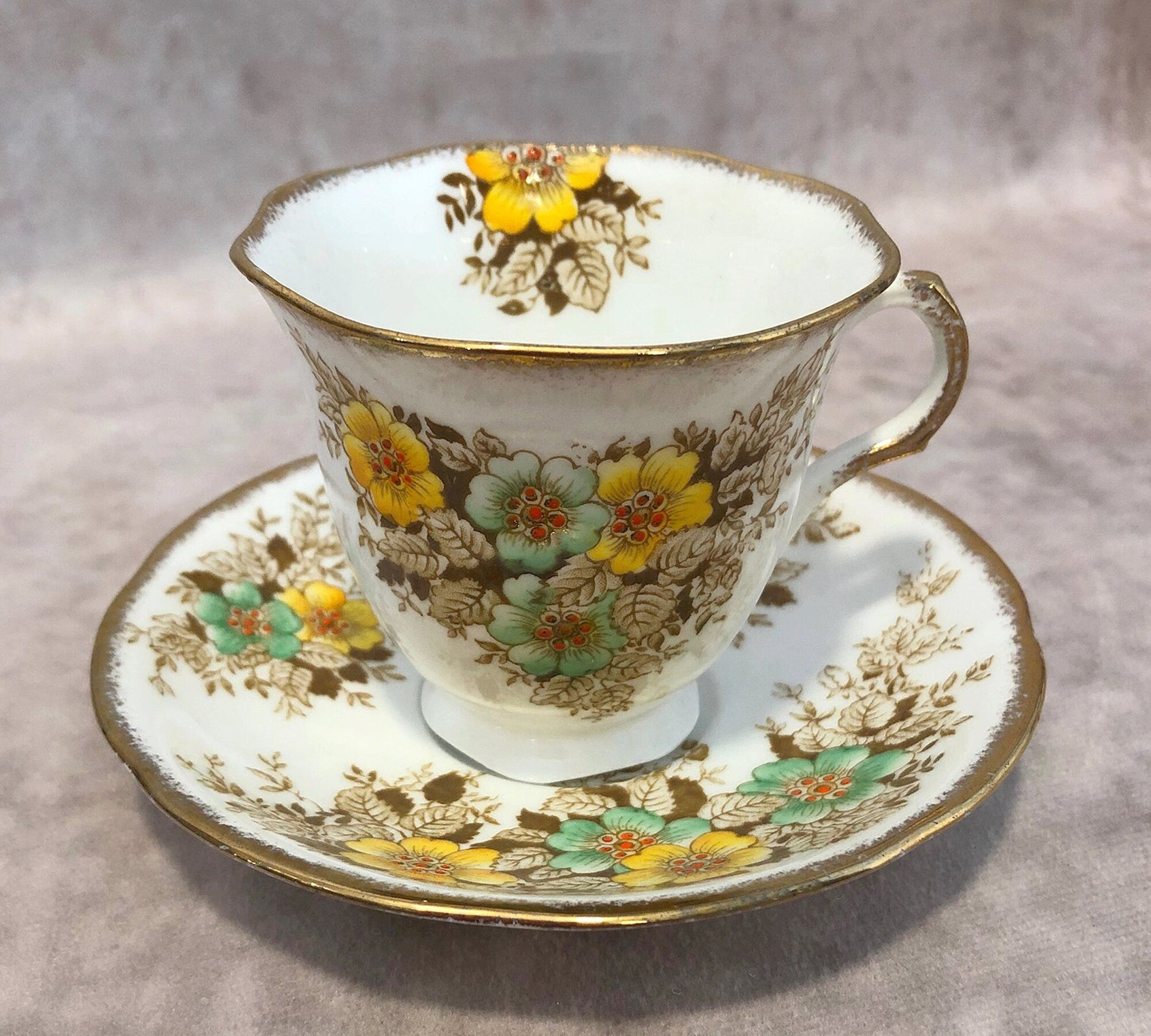 Cup and Saucer by Melba China Co. Fine Grade Tea Set Made in England. White background and yellow, green flowers with repousse centers. Mint condition. No cracks, no chips, gold holds very well. Very beautiful, rich looking cup and saucer. Marked the by manufacturer. Great gift idea.