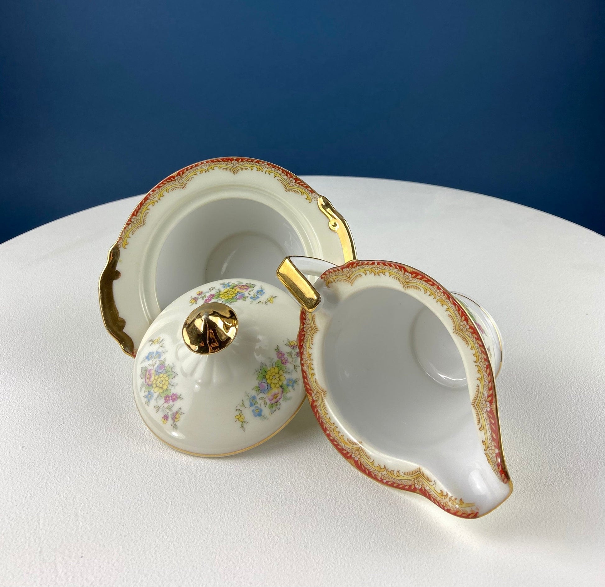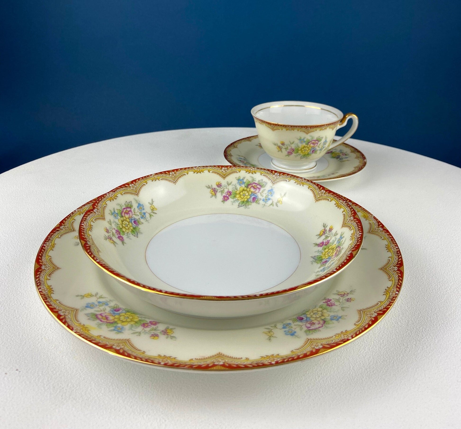 Vintage Dinner Set with Yellow and Red Band and Flower Garlands. Kikusui China: 8 Dinner Plates, 8 8" Salad Plates, 6 Soup Plates, 4 Cups and Saucers, with Matching Creamer and Sugar Bowls/Jars. Exquisite Dining and Serving. Wedding Registry. Very Good Condition. Marked by the Manufacturer.