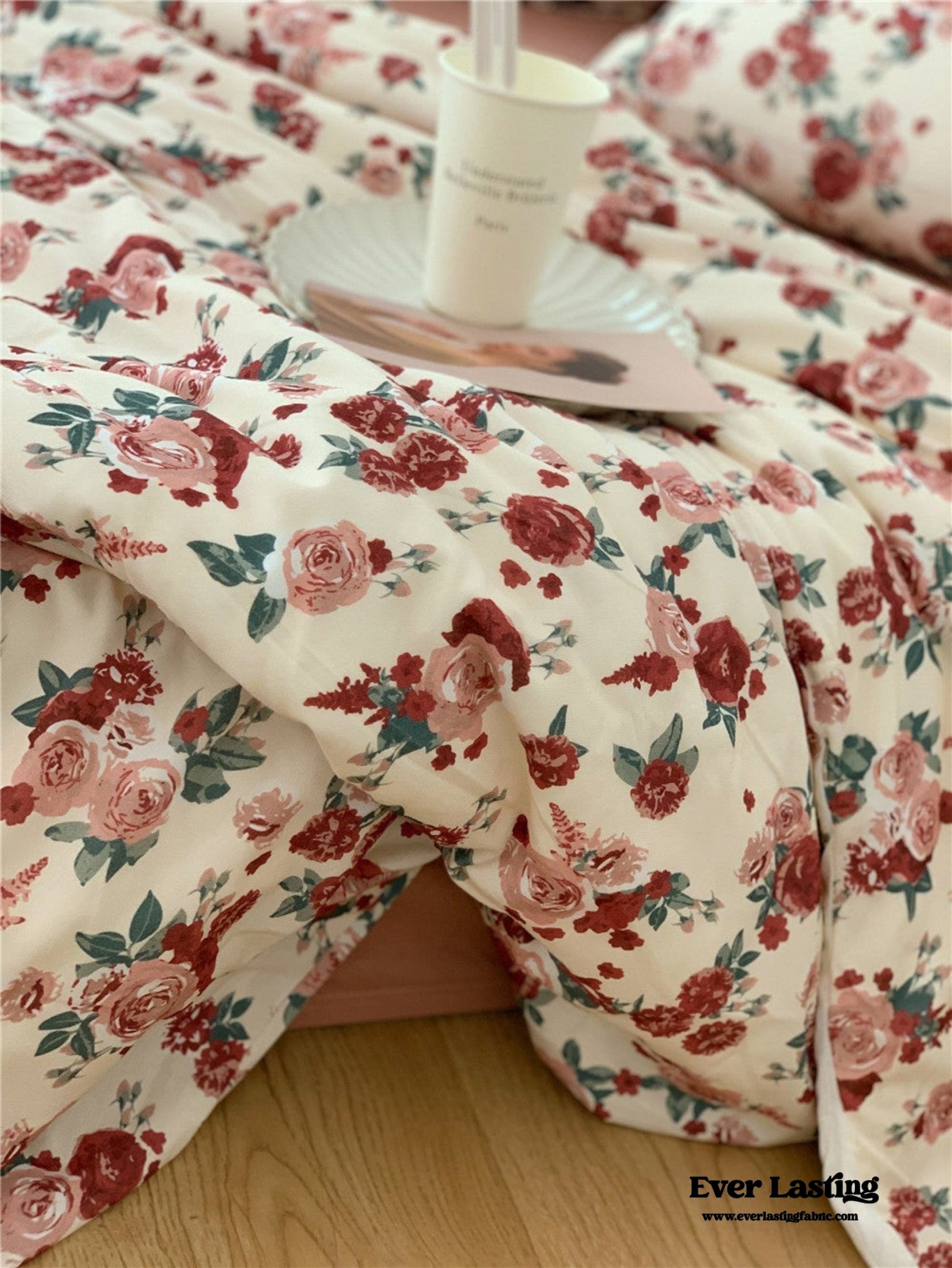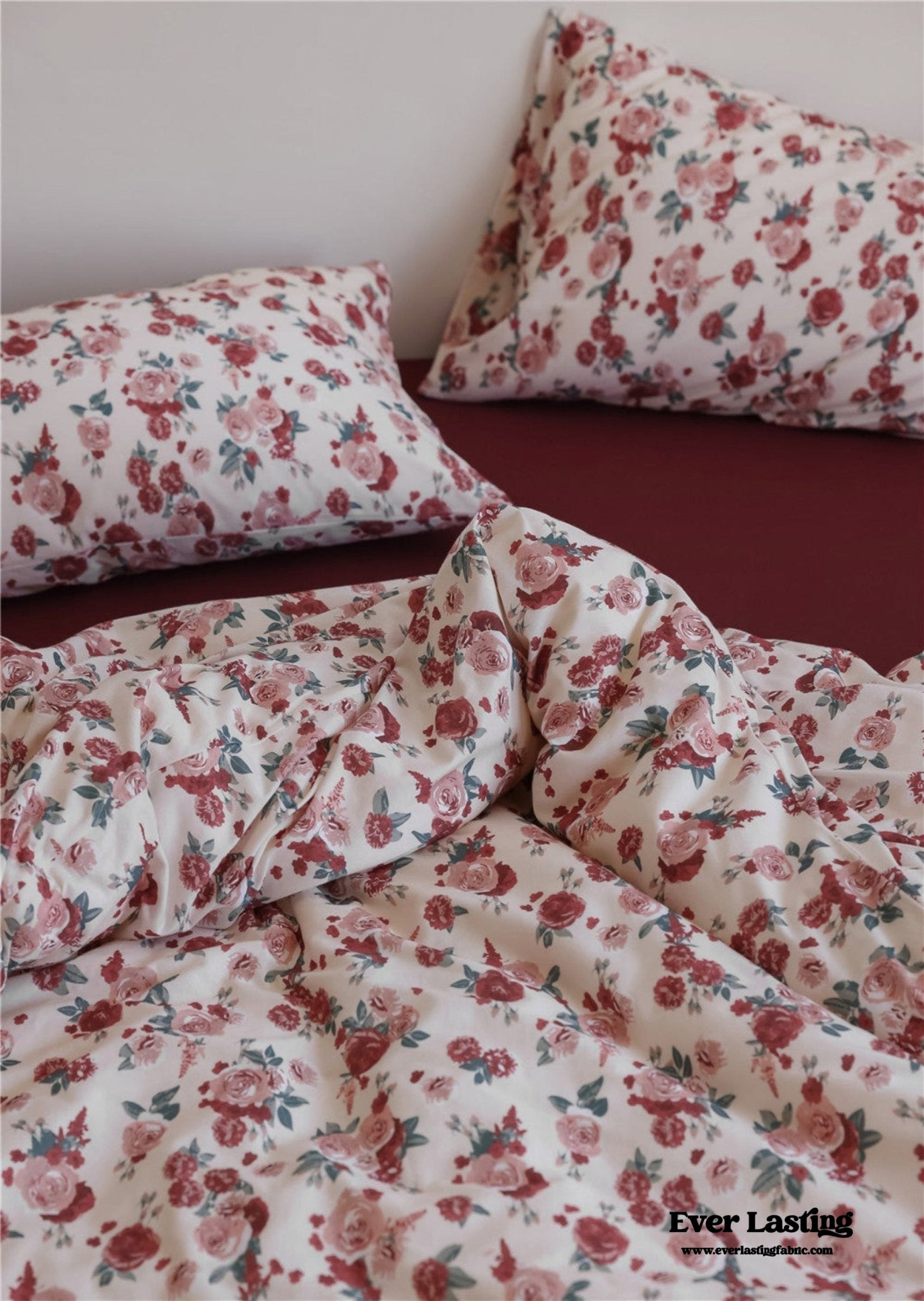 Vintage Floral Jersey Knit Bedding Set / Maroon Red