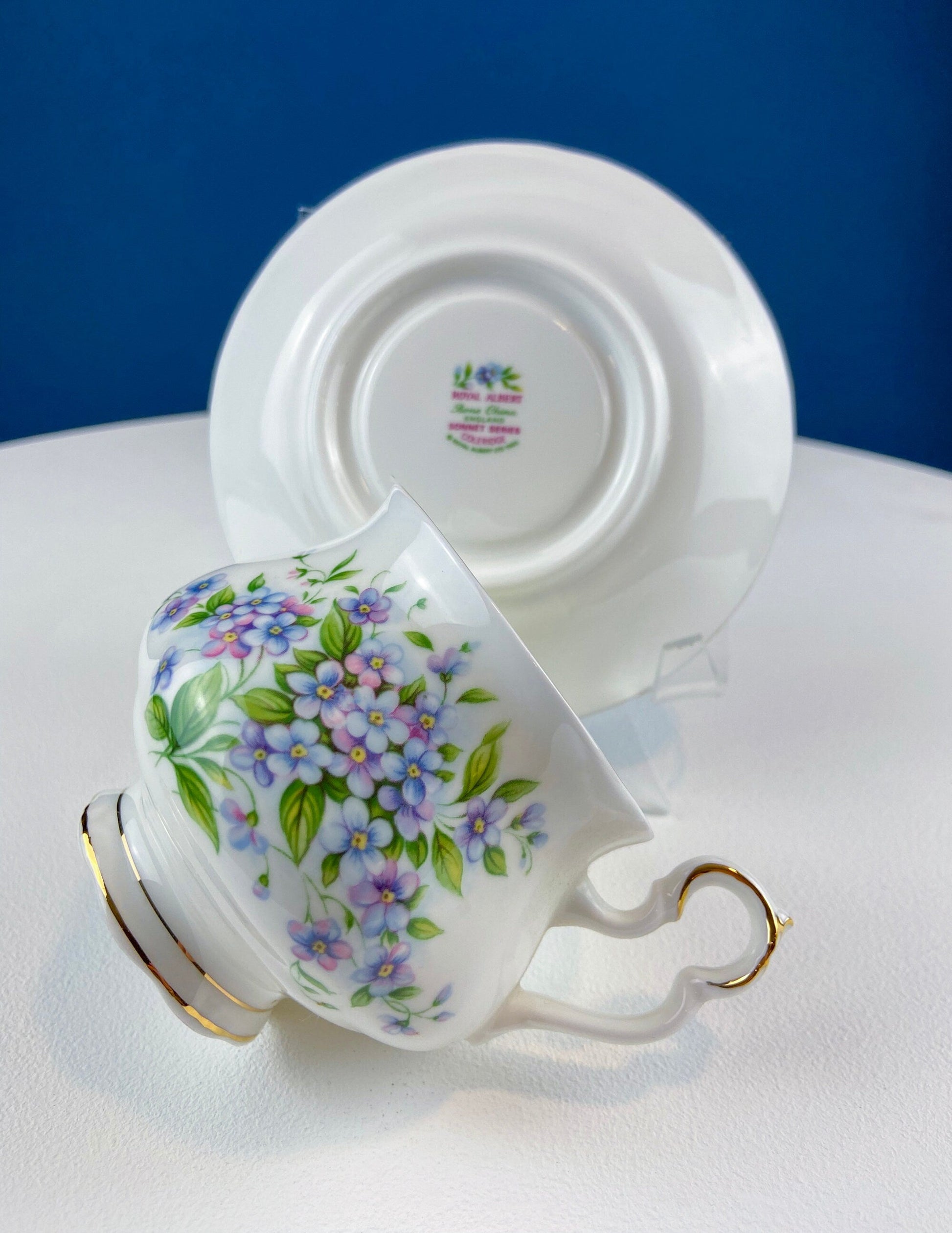 Vintage Forget-Me-Not Teacup & Saucer. Royal Albert Sonnet Series: Coleridge. Collectible Tea Set. English Breakfast in Garden. Wedding Gift. Luxury Living. Made in England. Excellent condition. Marked by the manufacturer.