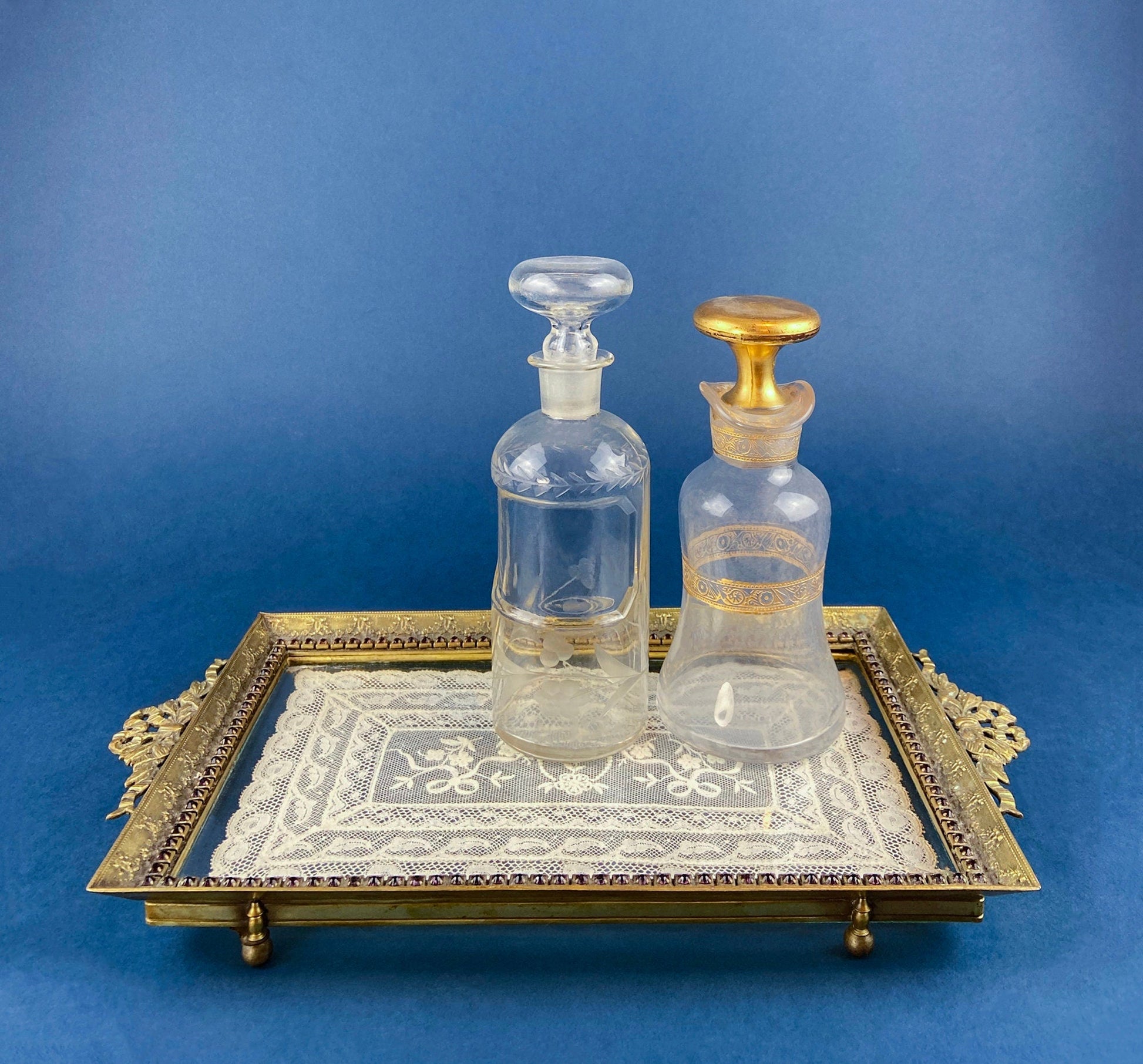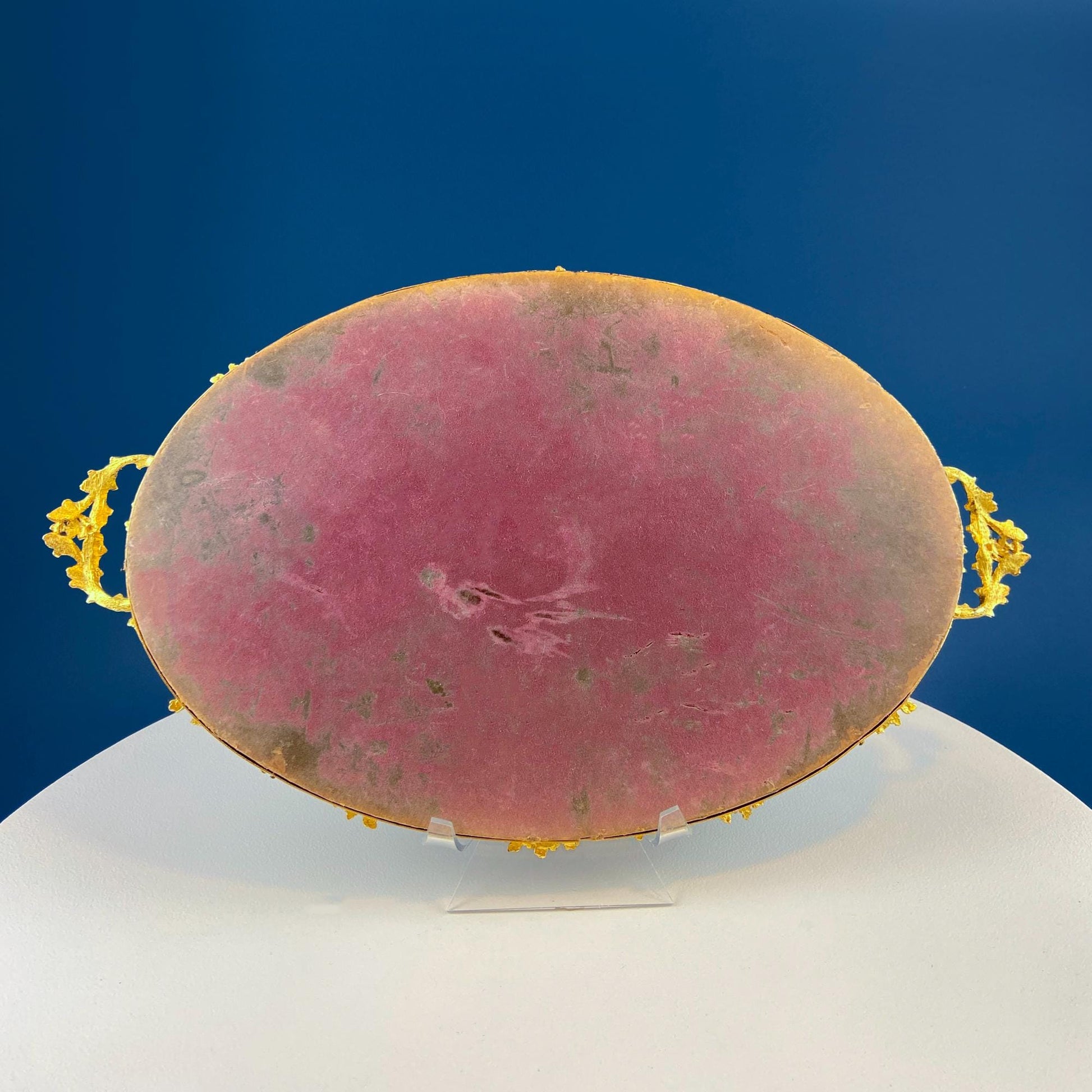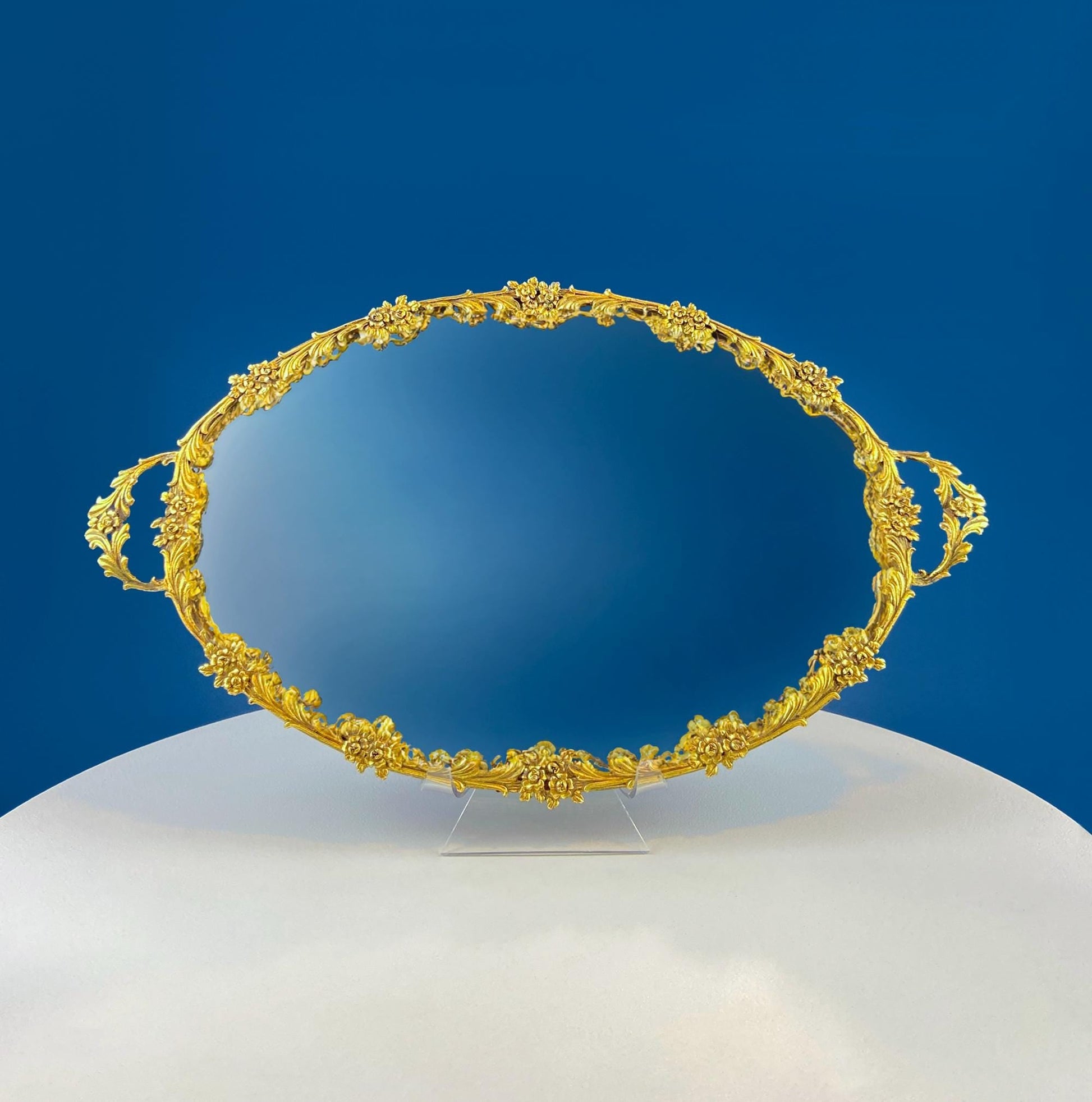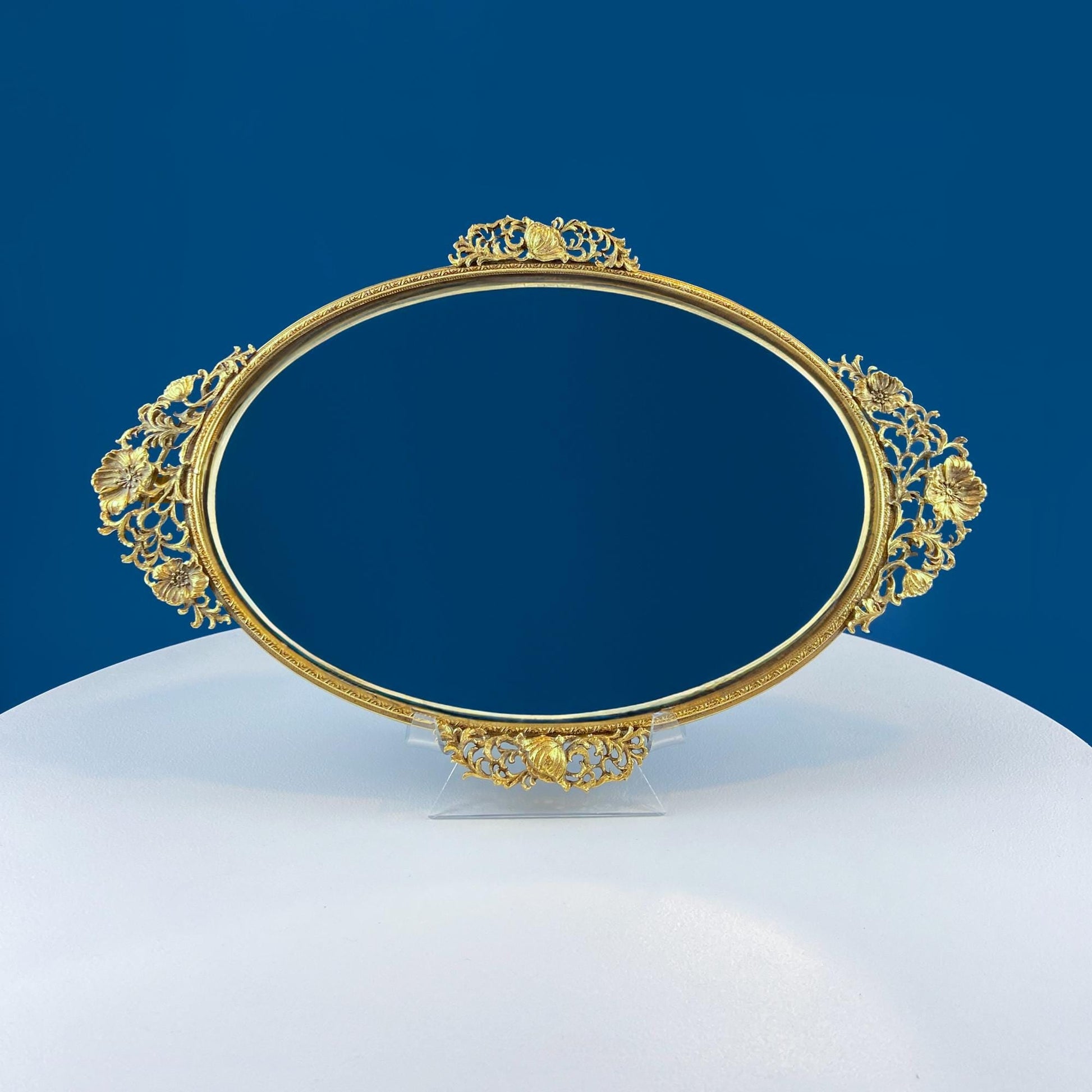 Vintage Gold Dresser Vanity Mirrored Tray. Rich Gilded Metal Tea Rose Oval Frame. Chic Bedroom Bath Perfume Display. Wall Hanging.