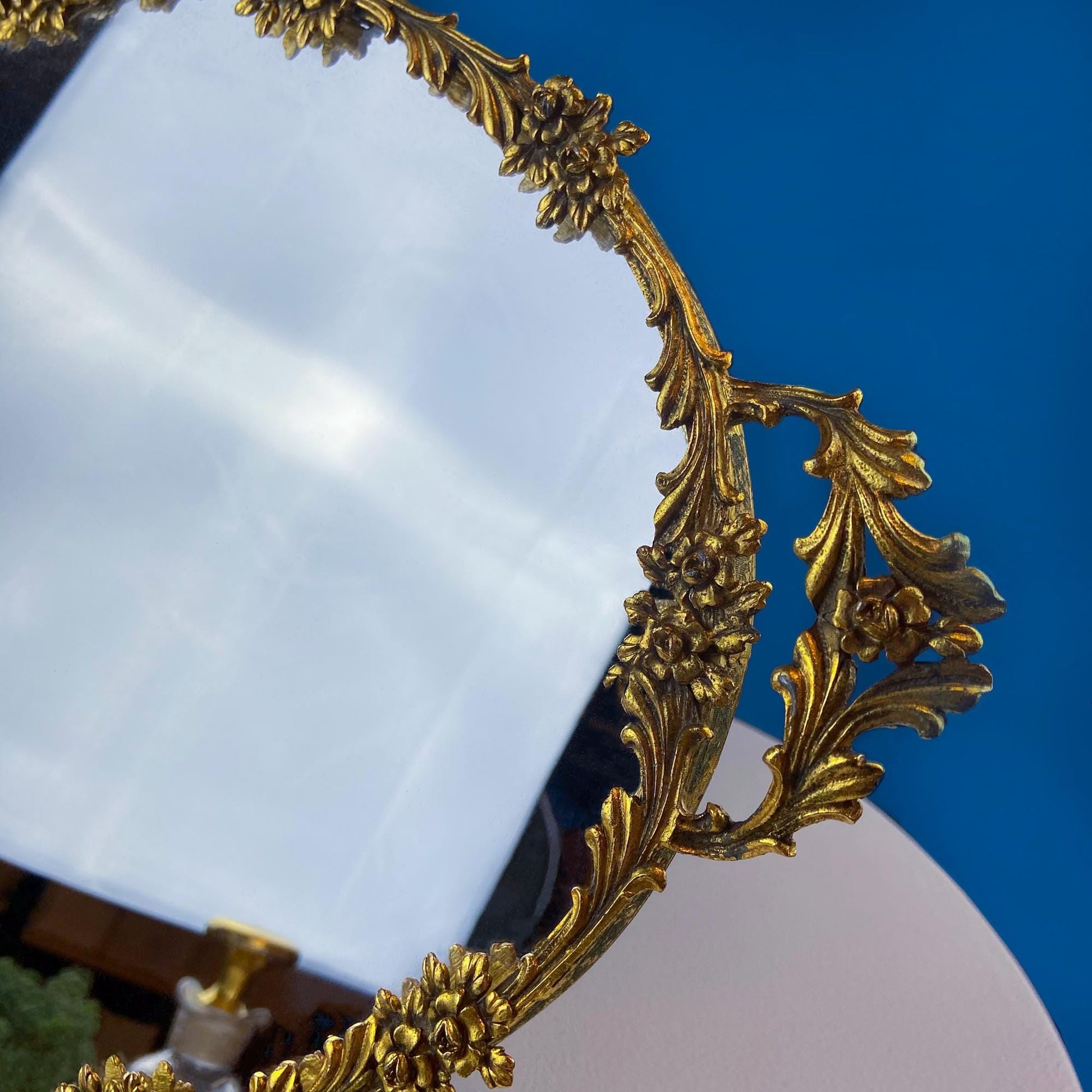 Vintage Gold Brass Dresser or Vanity Mirror Tray. Rich Floral Gilded Metal Motif. Oval Mirror. Wall Hanging. Chic Bedroom or Bath Decor, Accessories. Perfume or Cosmetic Display Rest. Gift for Her, Mom, Perfume User, Mirror Collector. Has Hook for Hanging as Decorative Mirror. Back is Covered with a Velveteen Fabric which is worn out, but Otherwise It is in Excellent Condition.