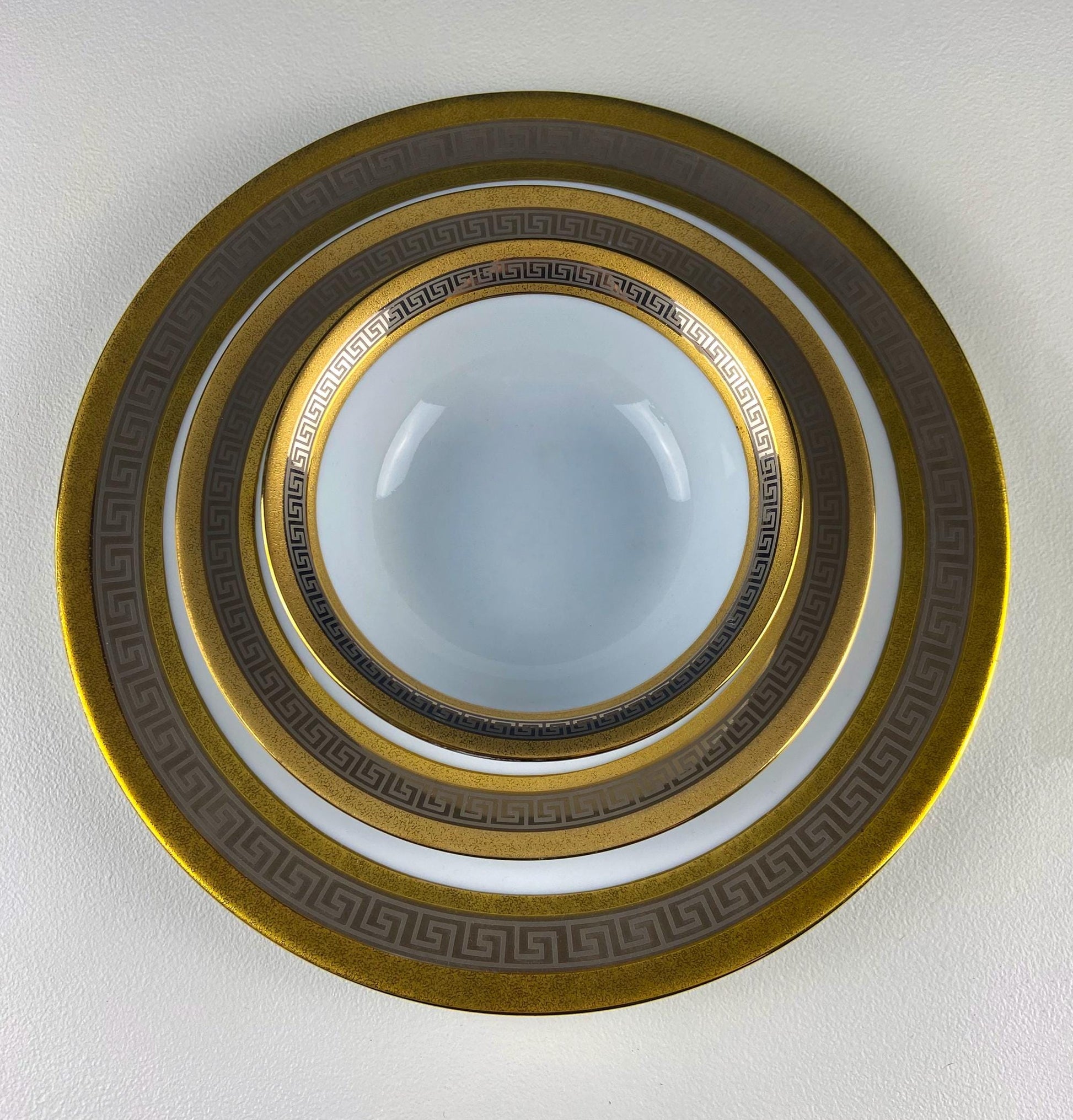 Stunning White, Gold, and Platinum Dinnerware Dish Set with Greek Motif. 11 Dinner Plates, 12 Salad Plates, 11 Soup Plates and 8 Berry Bowls. Vintage, Fine Sheng Xing Porcelain. Wedding Band China. Excellent Condition. Wedding Gift Registry. Dining Room Decor. Fine Dining. Holiday Celebration.