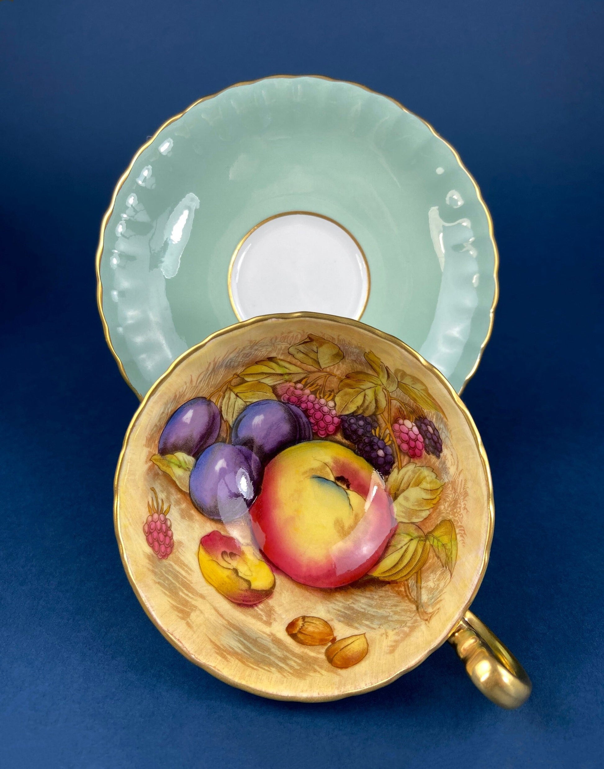 Vintage Tea Cup & Saucer. Aynsley Fine Bone China. Beautiful Fruit Motif: Peaches, Plums, Berries. Collectible Tea Set. Gift for Him or Her.