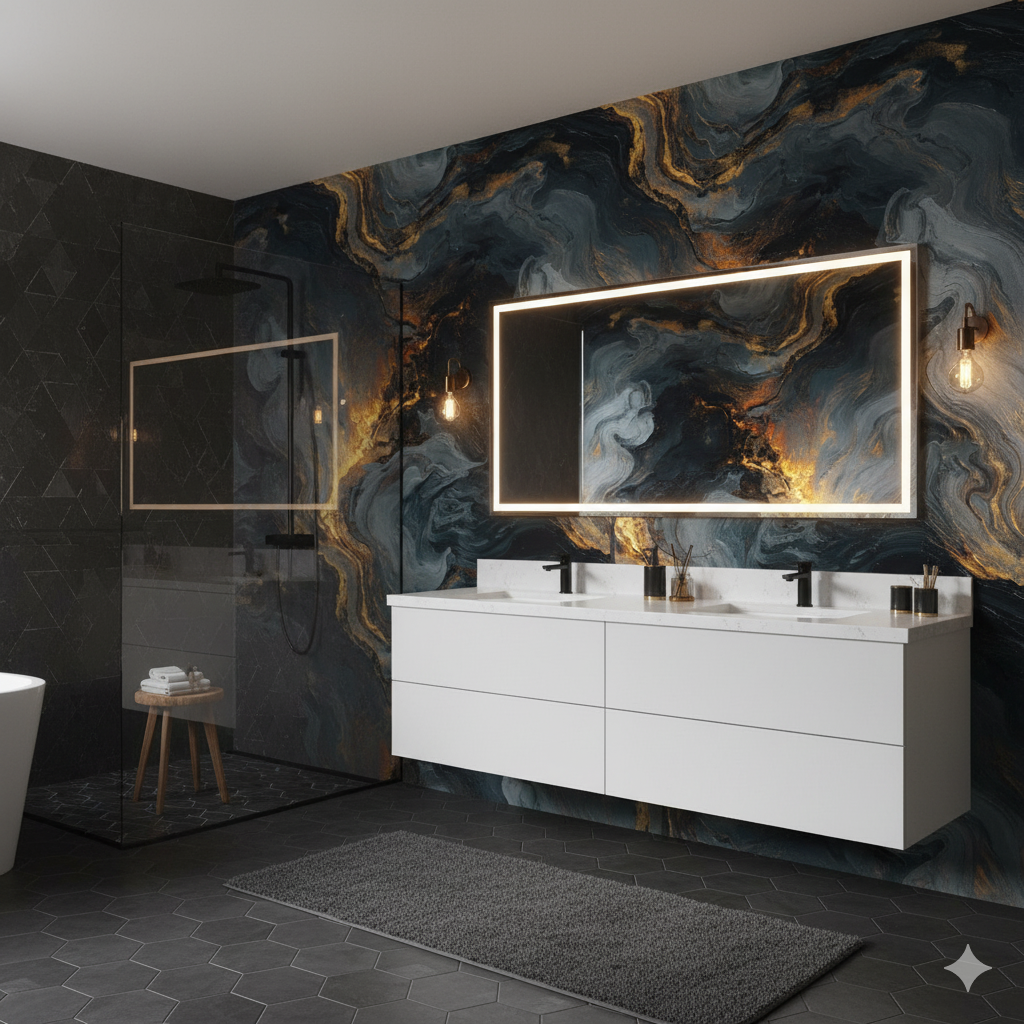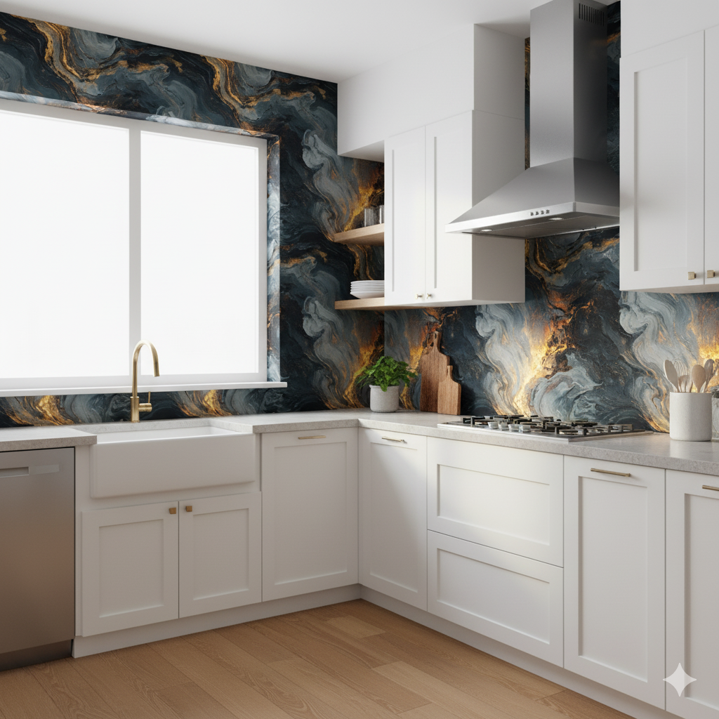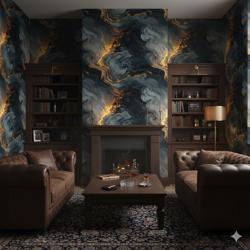 Smoky blacks, charcoals, and molten gold ripple across the surface like the aftermath of volcanic fire meeting cooling rock. This pattern radiates power and drama, with textures that mimic both lava flows and marbled stone, highlighted by streaks of glowing ember-like metallics. The movement feels alive — swirling, consuming, and reshaping — making it perfect for accent walls where boldness is essential. It thrives in luxurious interiors, modern penthouses, and moody lounges, commanding attention without needing additional embellishment. The richness of its dark palette, interrupted by flares of light, offers both a sense of destruction and creation, channeling raw natural forces into pure sophistication.